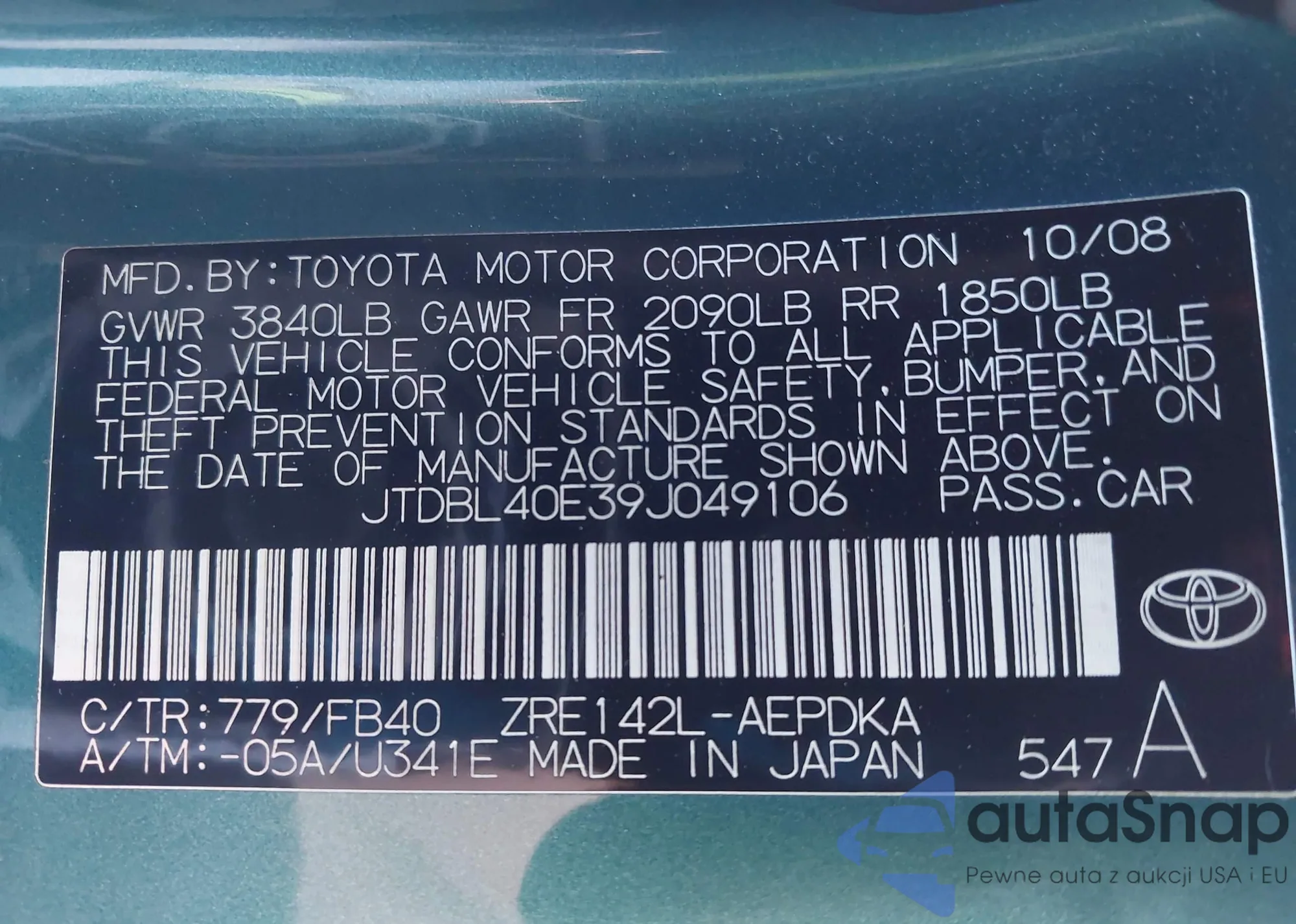 LOT: 43476876 VIN: JTDBL40E39J049106