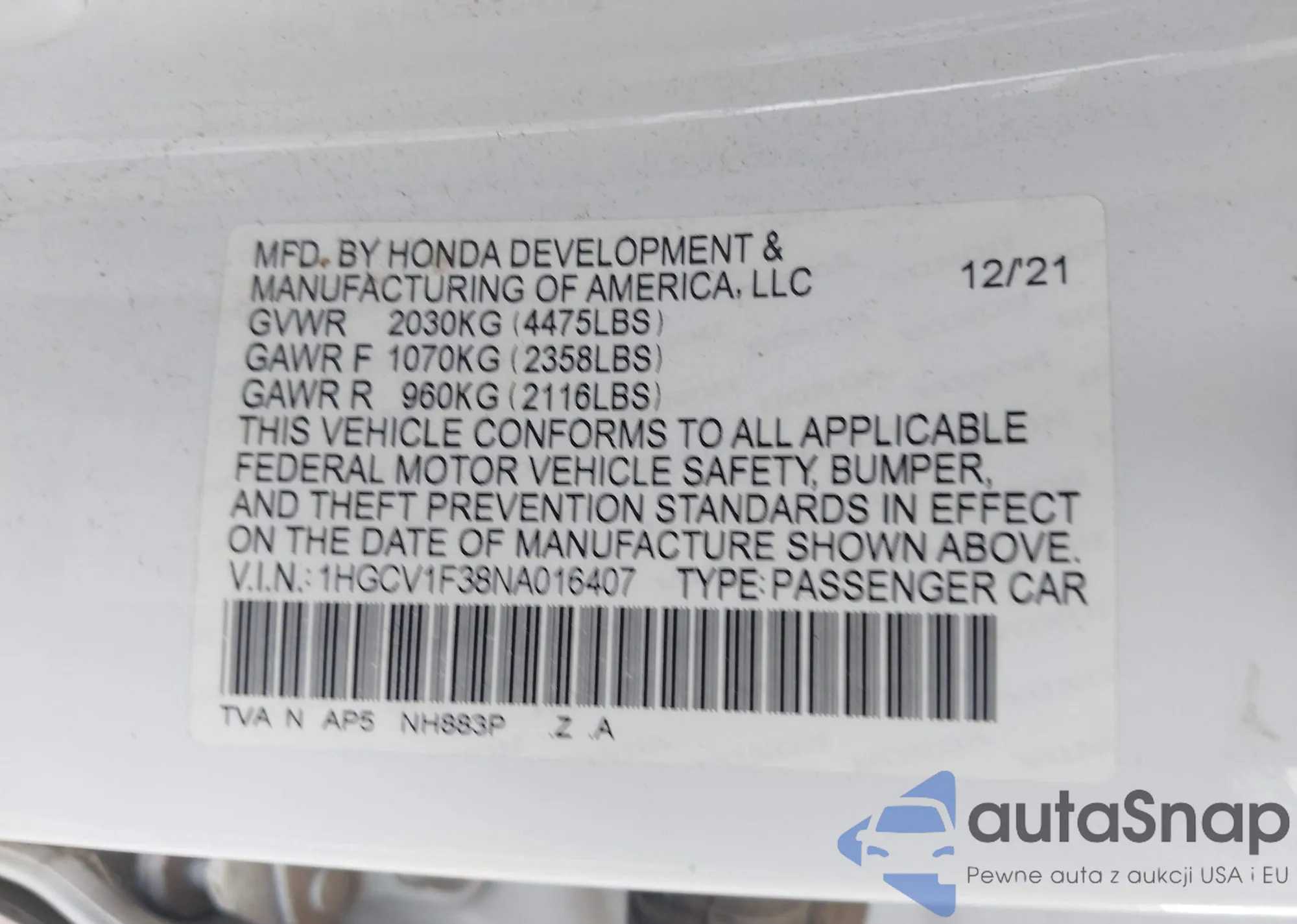 LOT: 43326864 VIN: 1HGCV1F38NA016407
