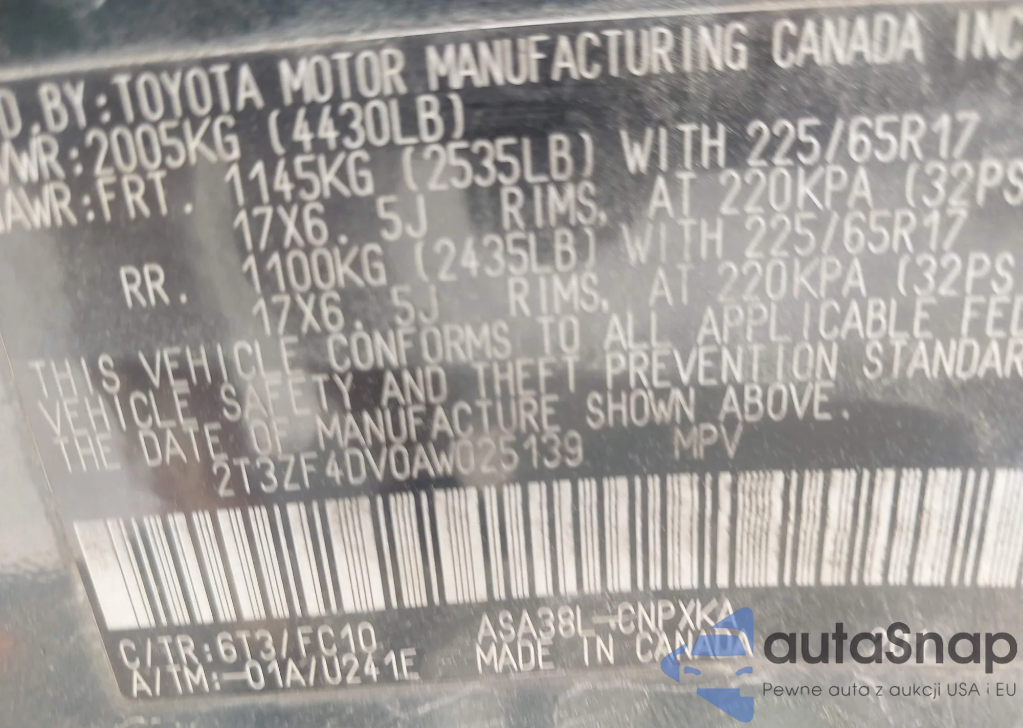 • VIN 2T3ZF4DV0AW025139