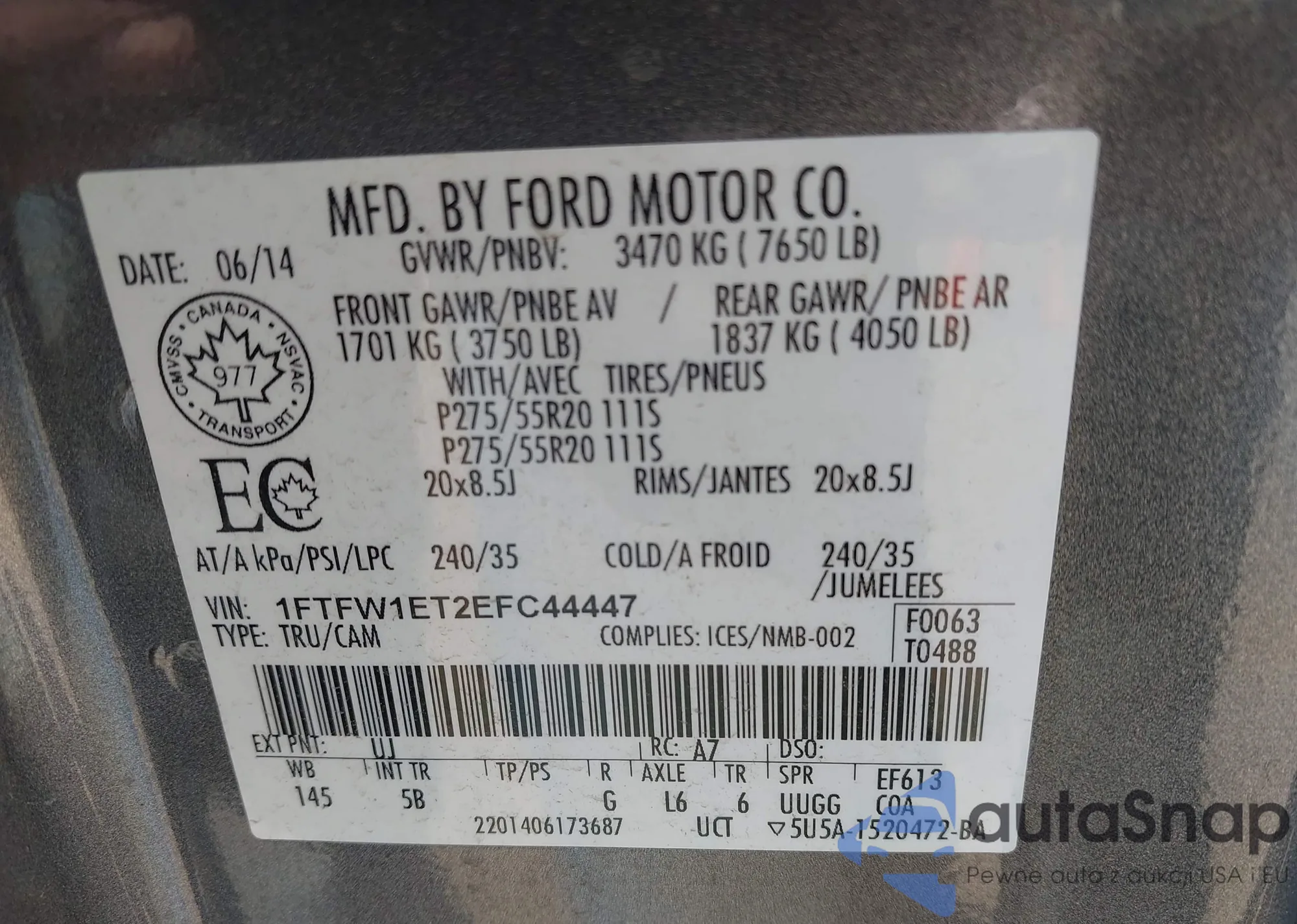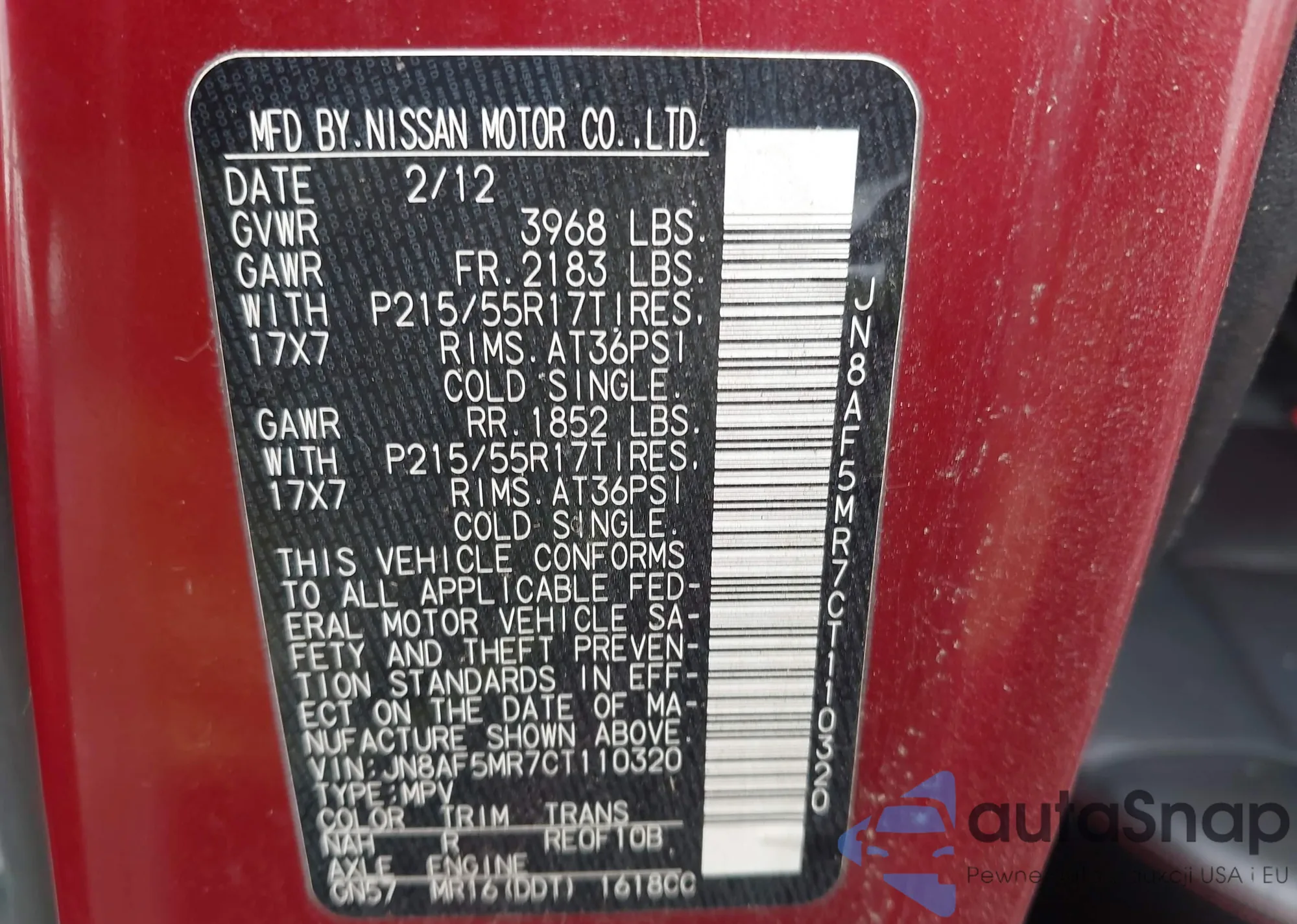 LOT: 43305768 VIN: JN8AF5MR7CT110320