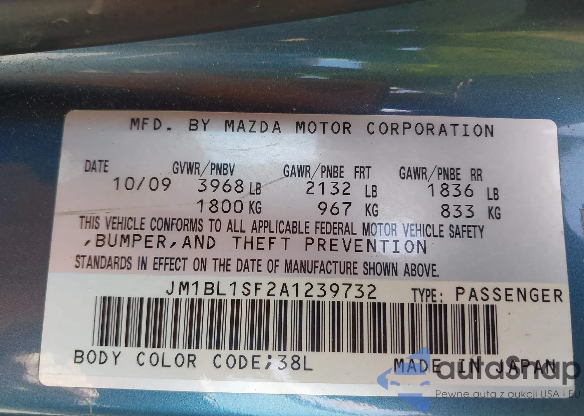LOT: 43307854 VIN: JM1BL1SF2A1239732
