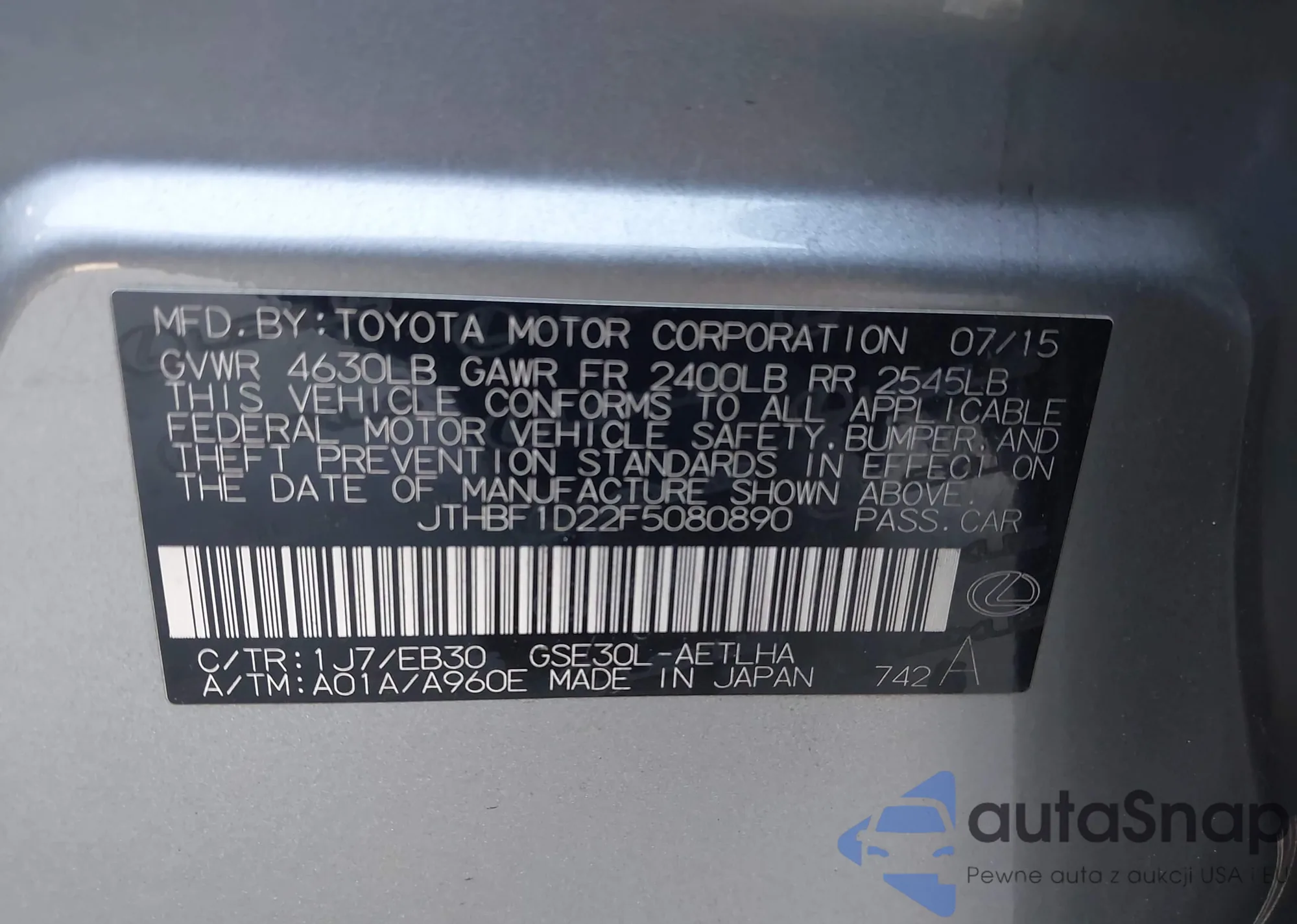 LOT: 43325386 VIN: JTHBF1D22F5080890