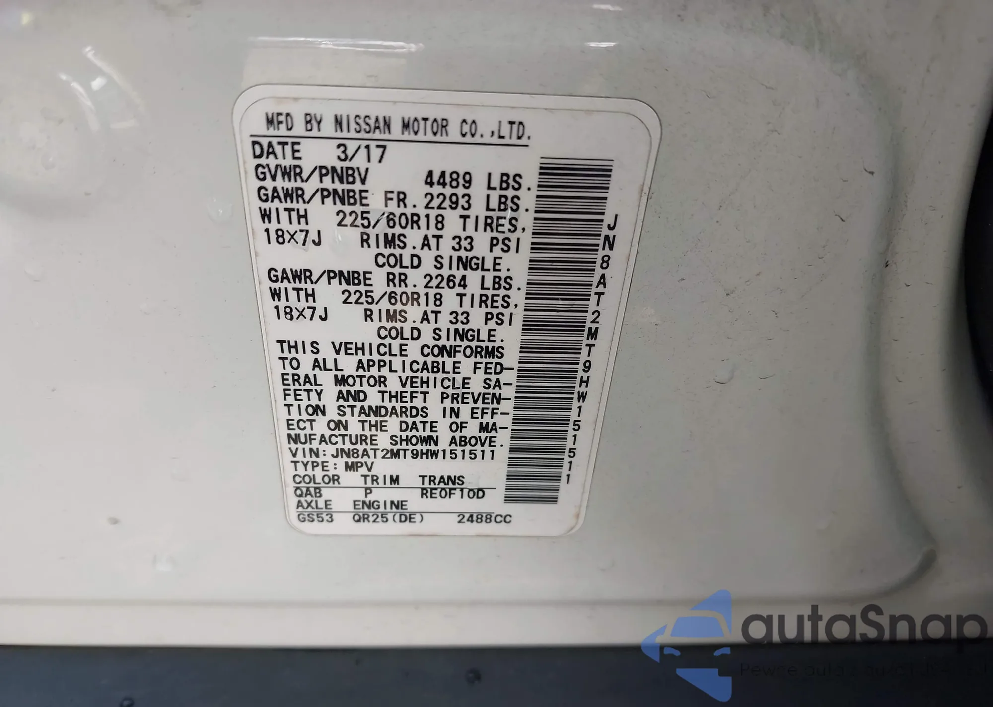 LOT: 43174081 VIN: JN8AT2MT9HW151511