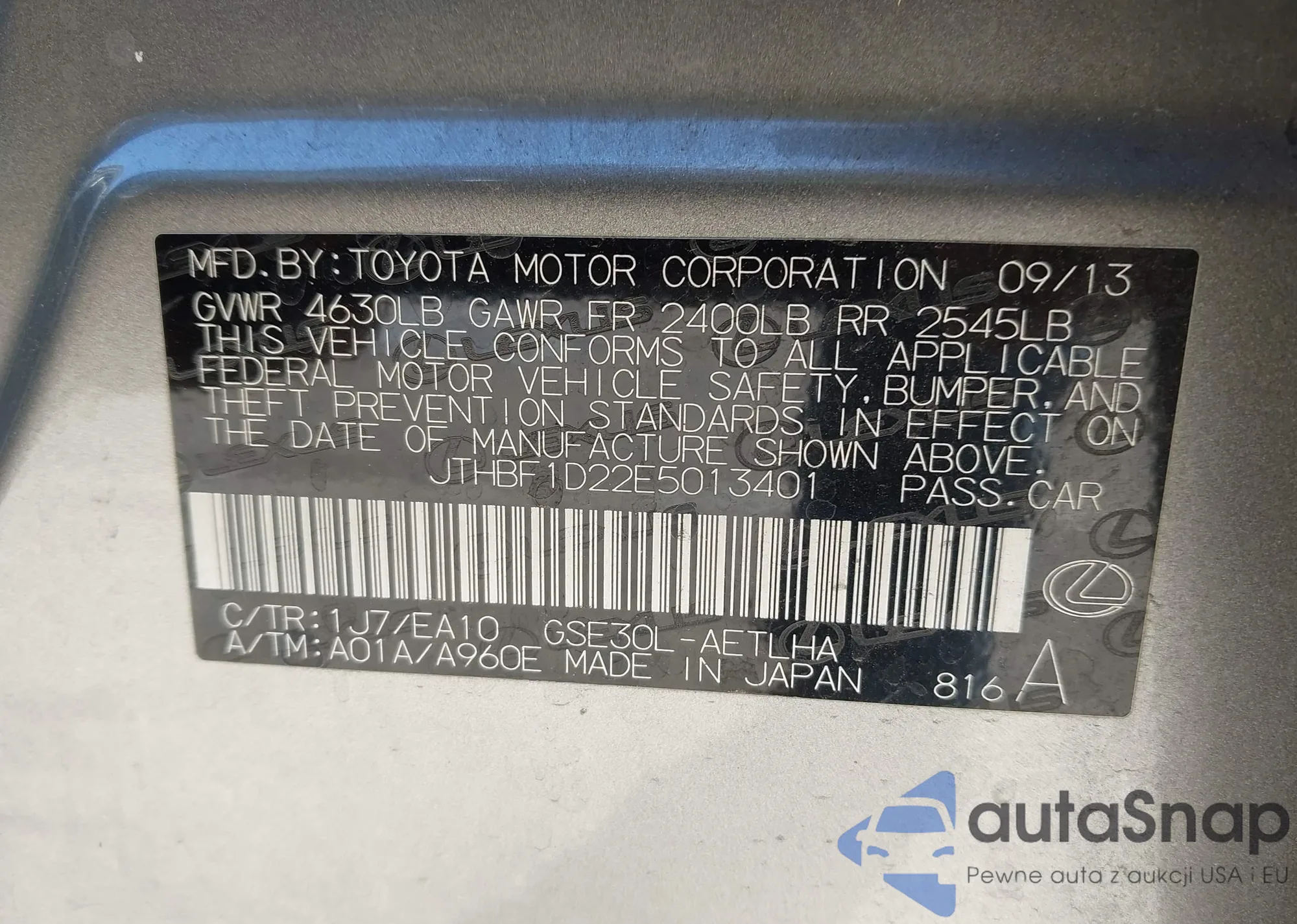 LOT: 43324059 VIN: JTHBF1D22E5013401