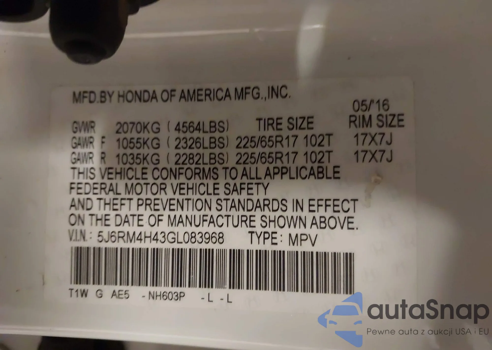 • VIN 5J6RM4H43GL083968