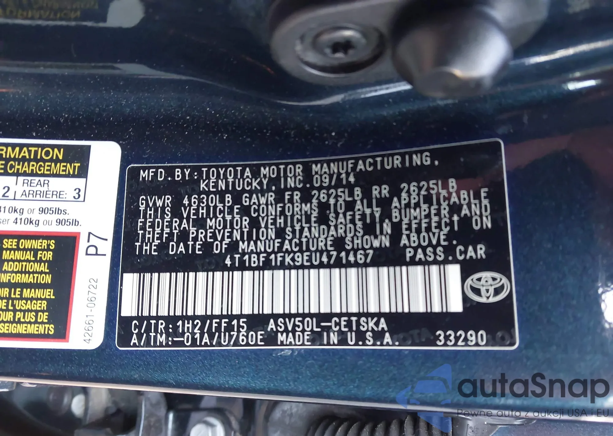 • VIN 4T1BF1FK9EU471467