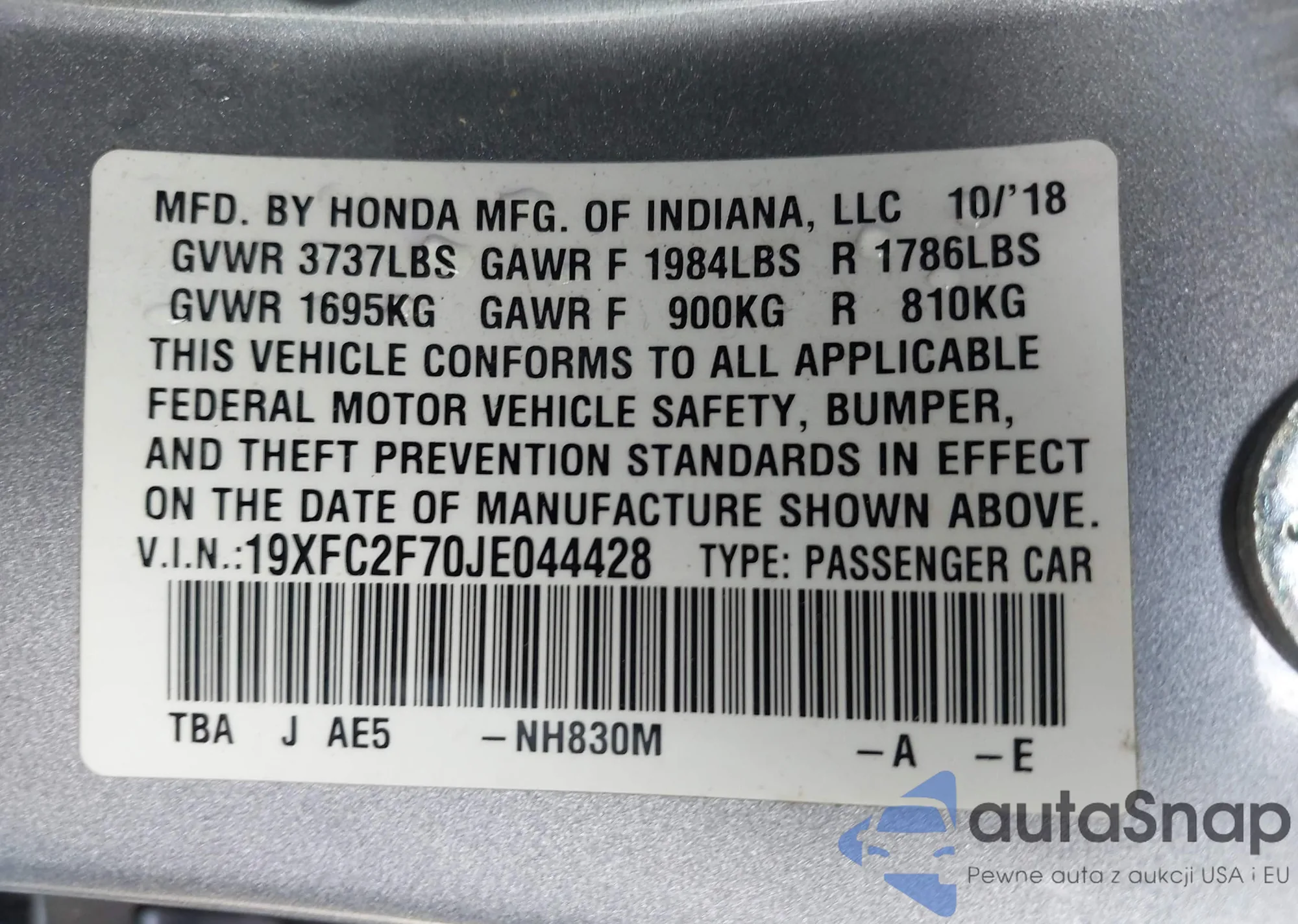 LOT: 43400886 VIN: 19XFC2F70JE044428