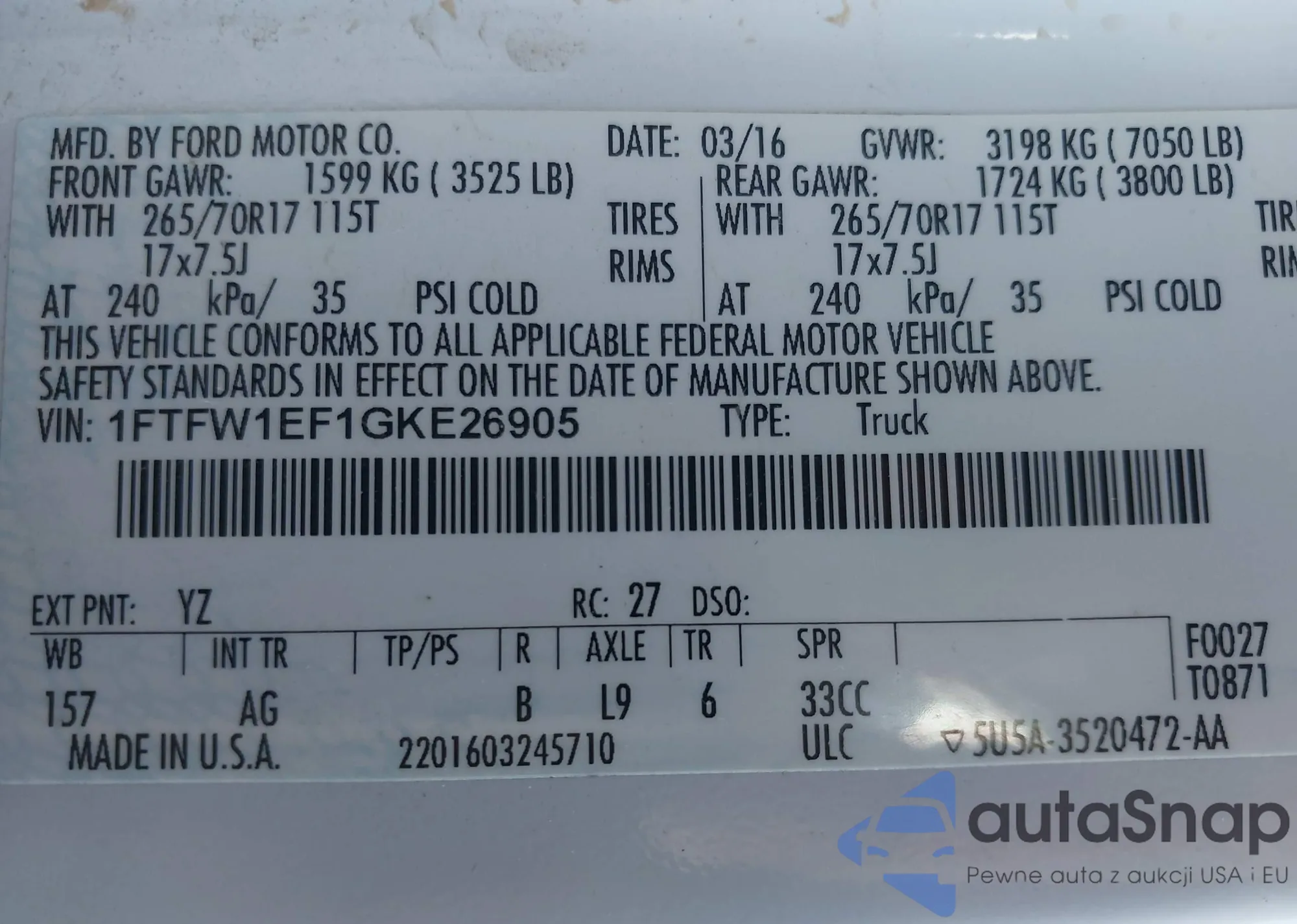 LOT: 43303504 VIN: 1FTFW1EF1GKE26905
