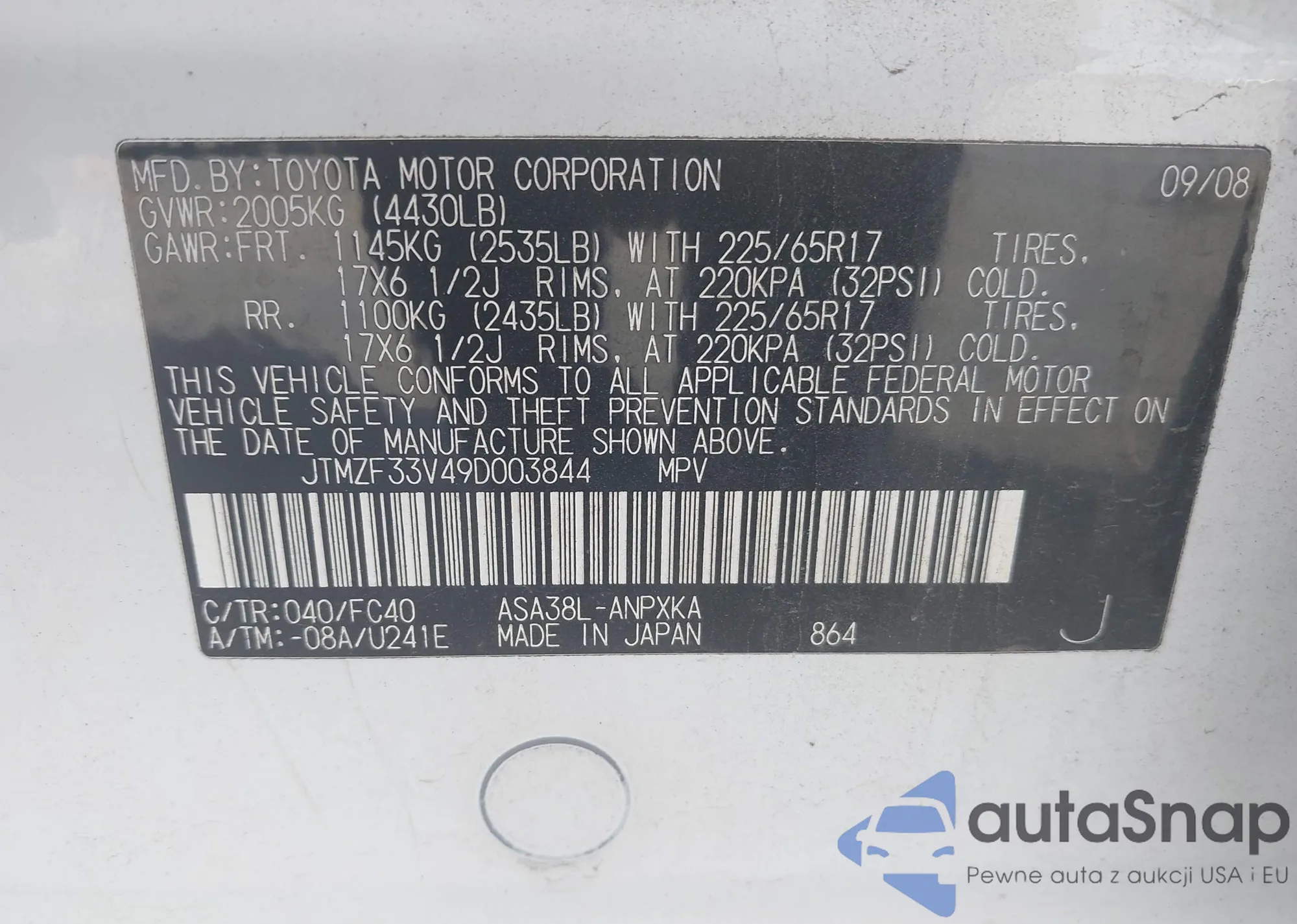 LOT: 43311183 VIN: JTMZF33V49D003844