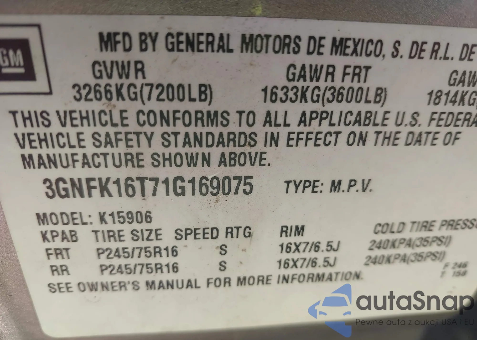 LOT: 43378682 VIN: 3GNFK16T71G169075