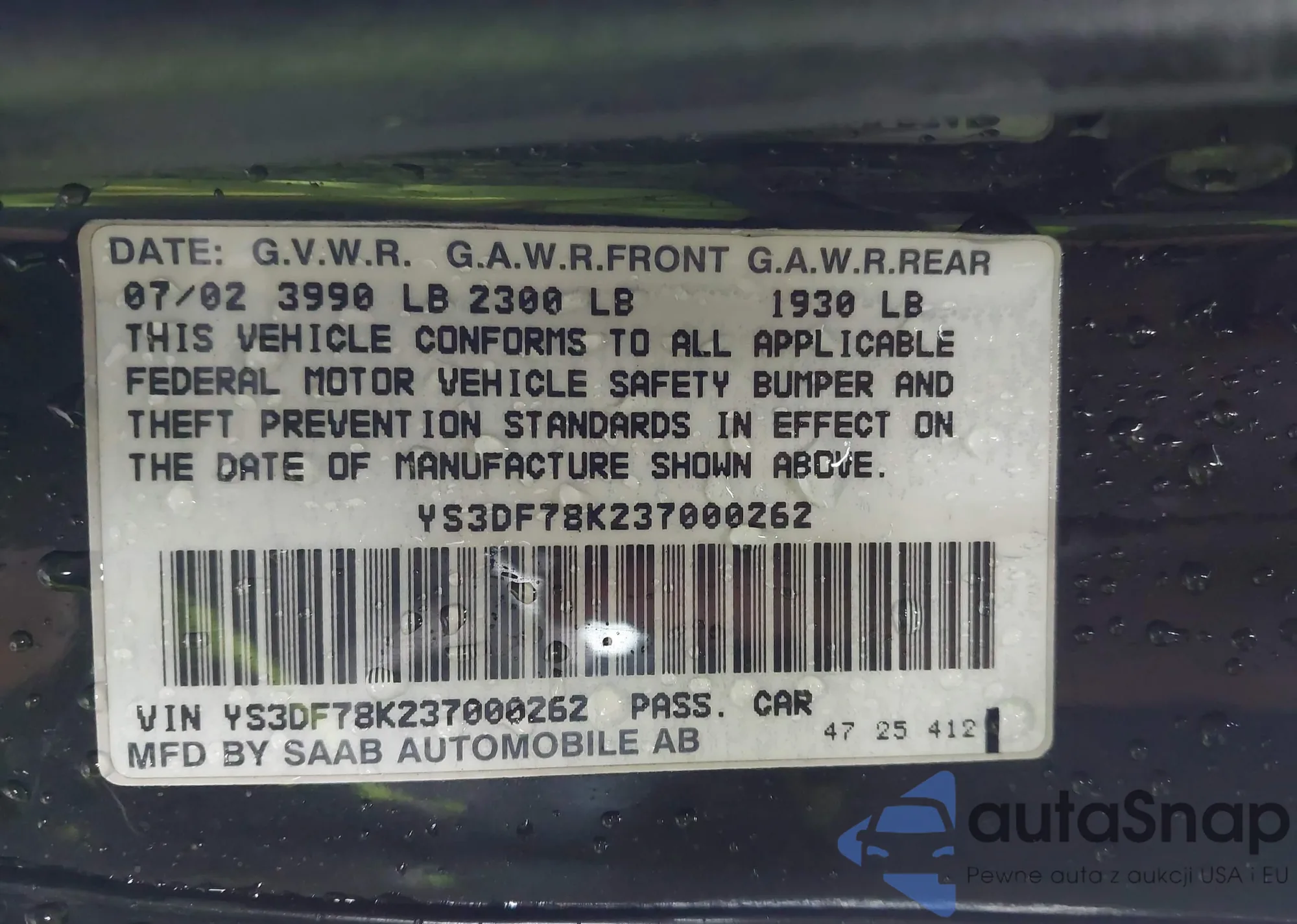 LOT: 43436811 VIN: YS3DF78K237000262