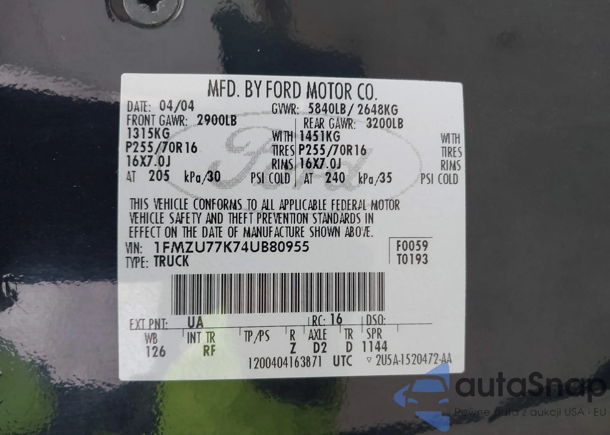 • VIN 1FMZU77K74UB80955