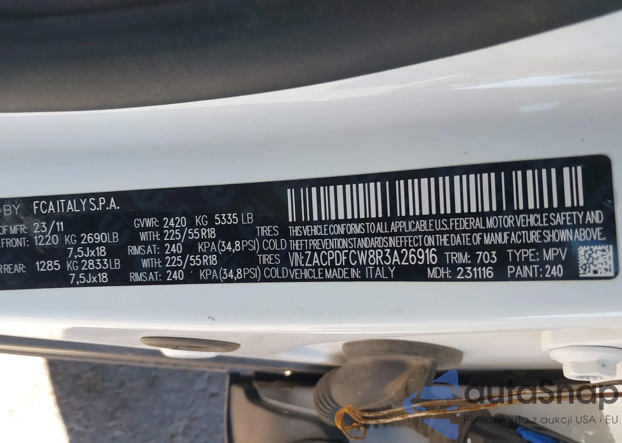 LOT: 43457100 VIN: ZACPDFCW8R3A26916