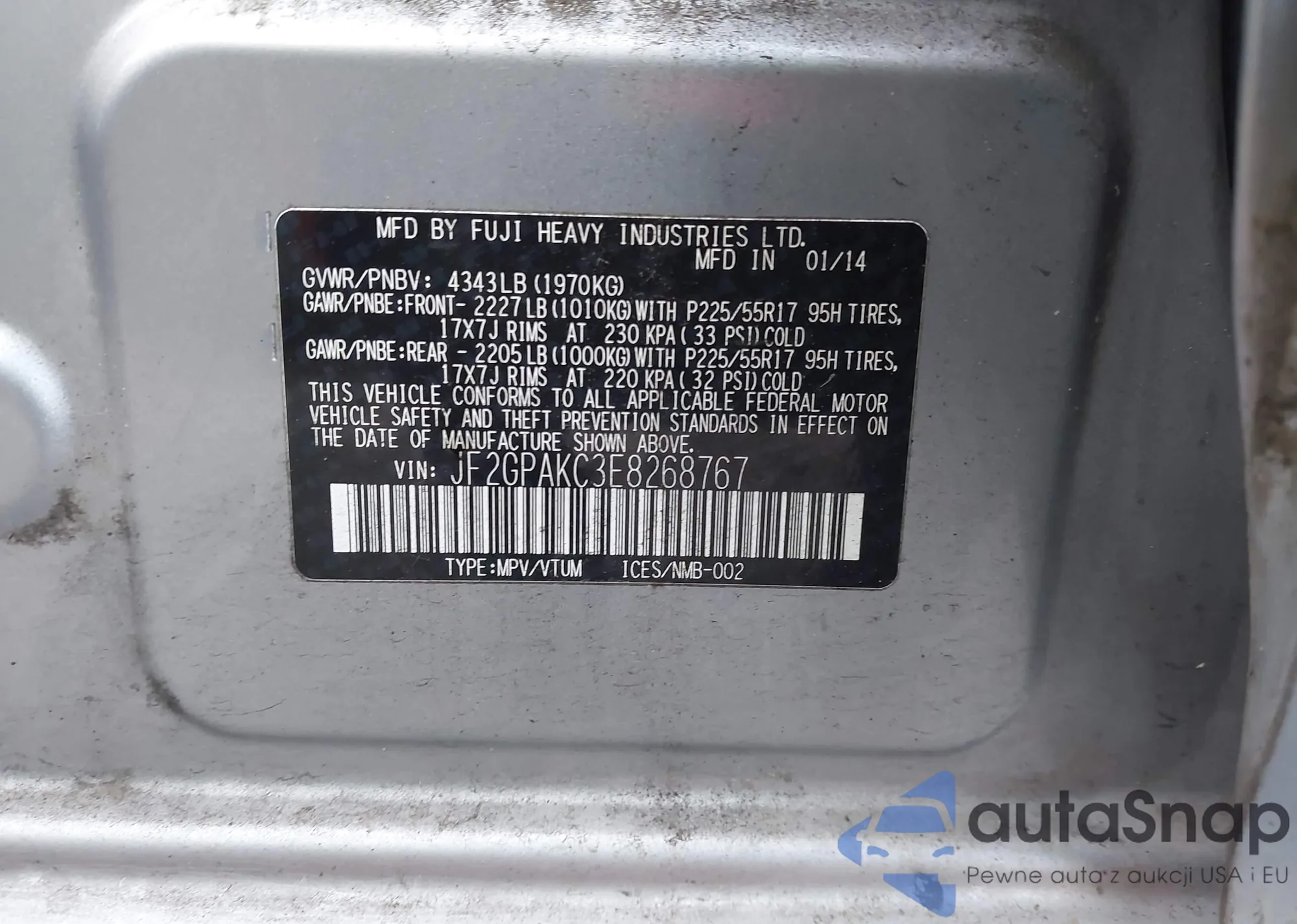 LOT: 43493124 VIN: JF2GPAKC3E8268767