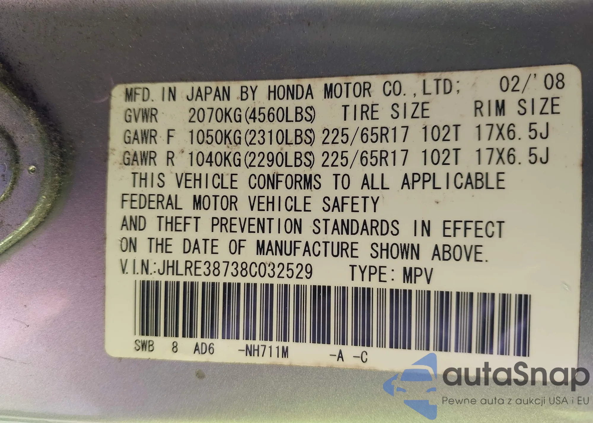 LOT: 43325350 VIN: JHLRE38738C032529