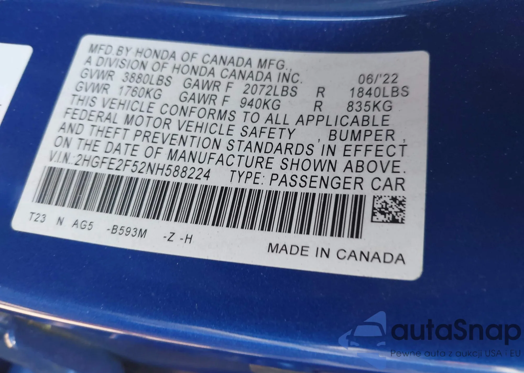 LOT: 43008586 VIN: 2HGFE2F52NH588224