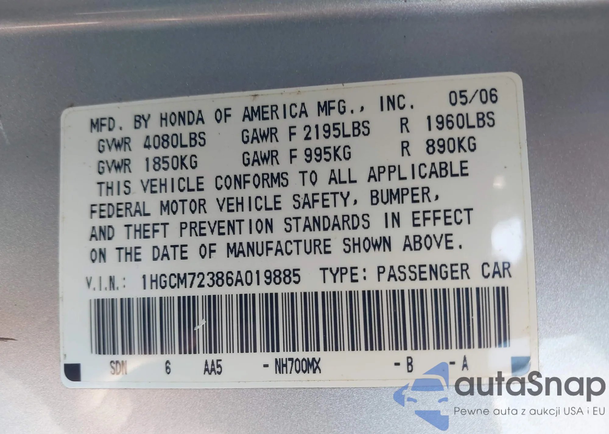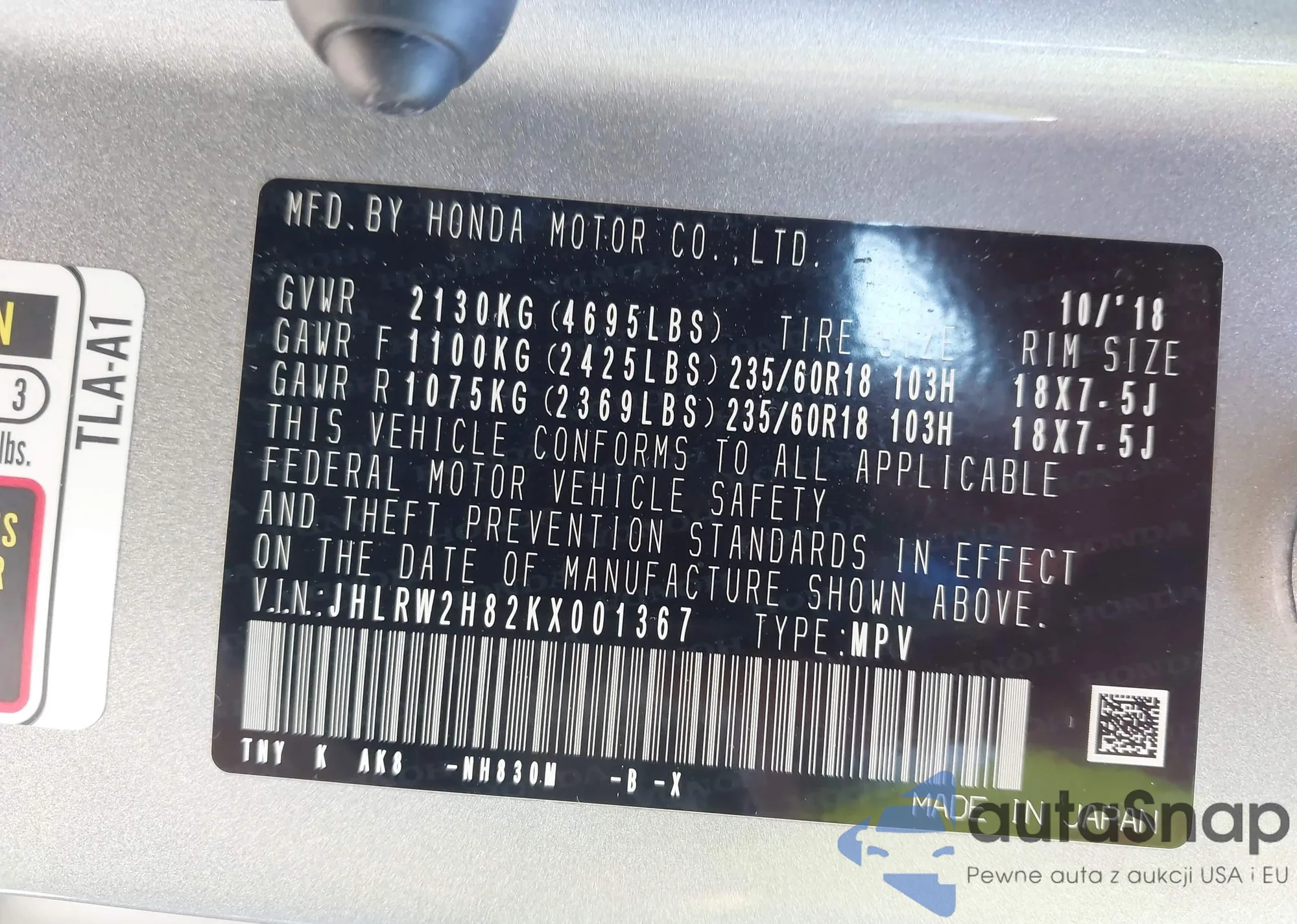 • VIN JHLRW2H82KX001367