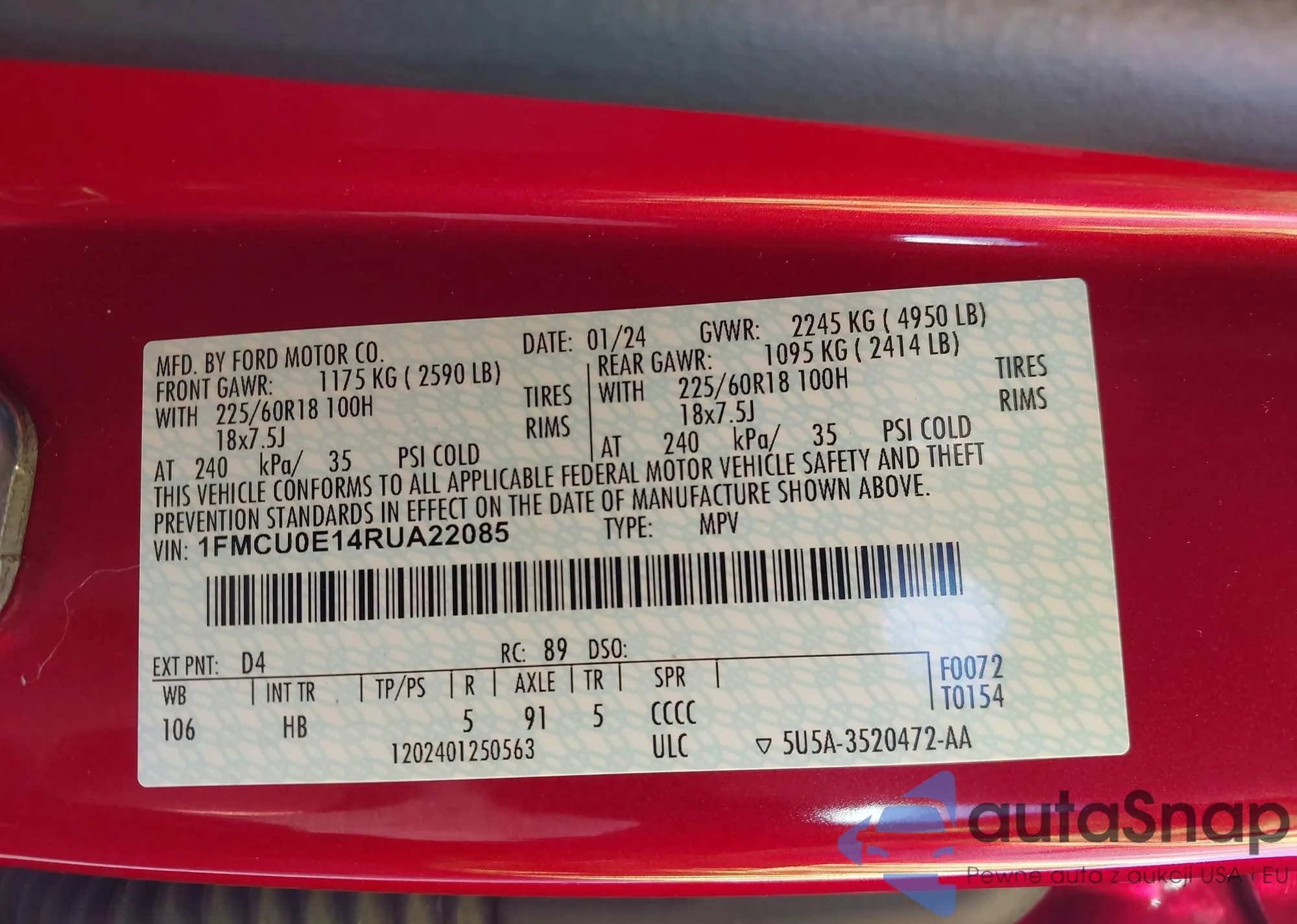 • VIN 1FMCU9D78AKD07463