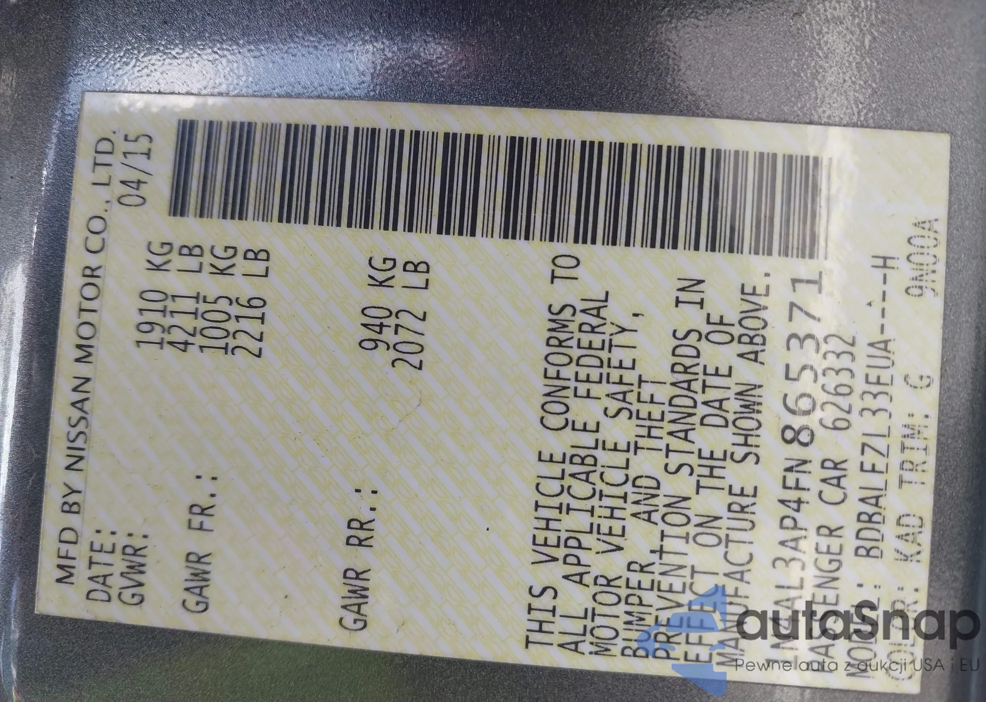 • VIN 1N4AL3AP4FN865371