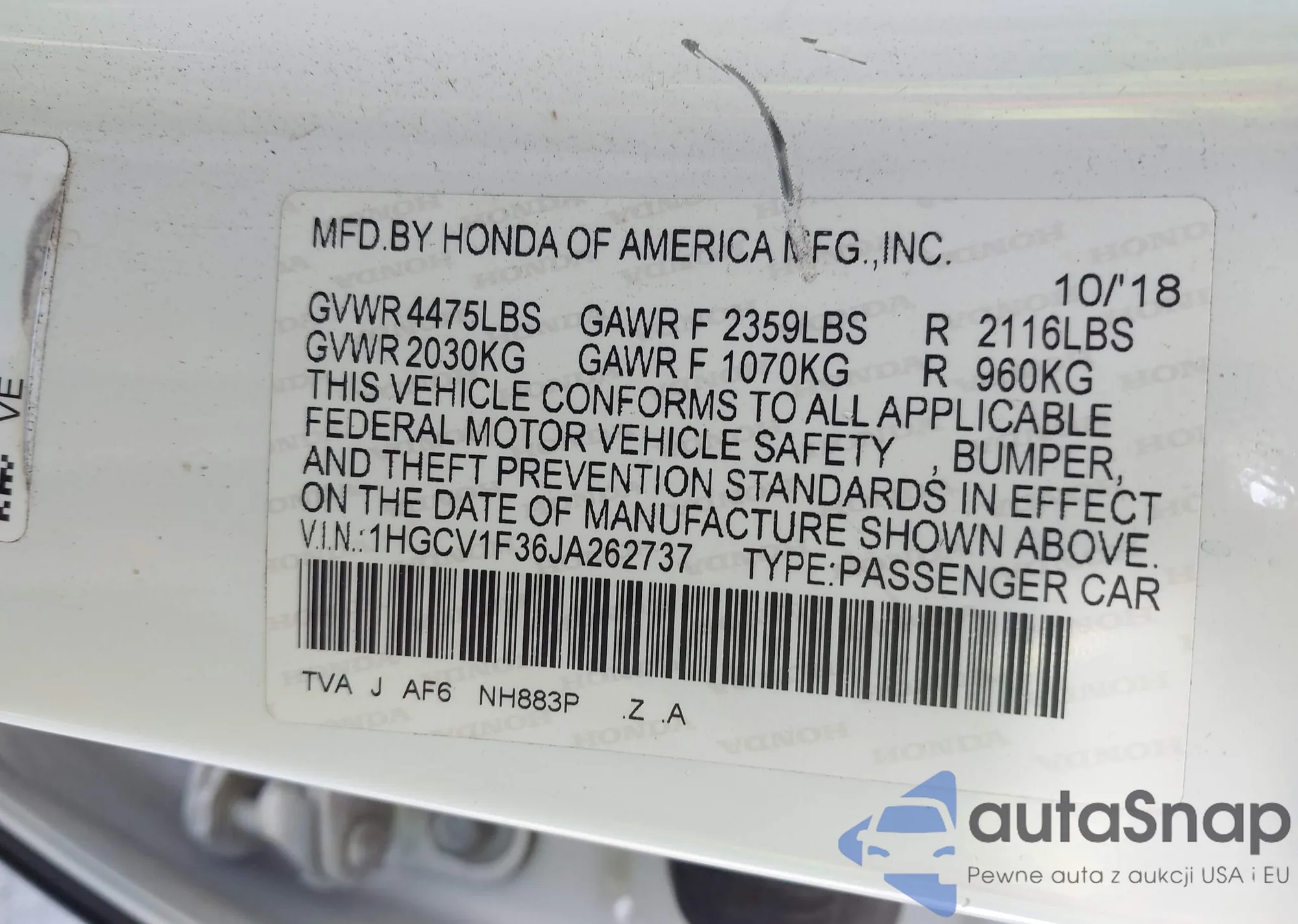 LOT: 43427545 VIN: 1HGCV1F36JA262737