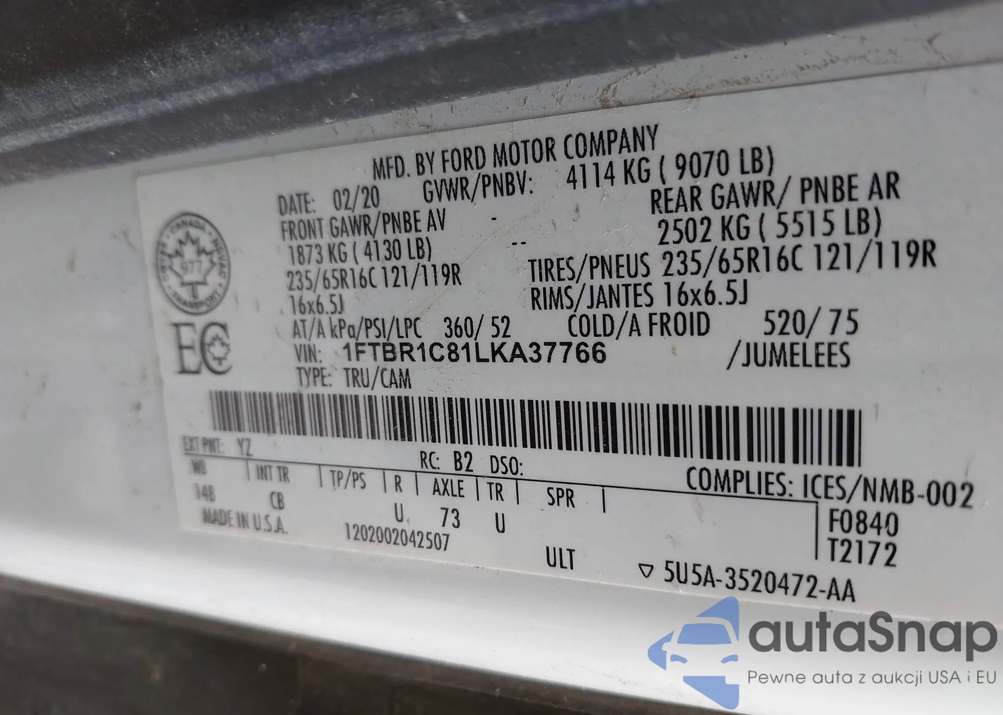 LOT: 42693396 VIN: 1FTBR1C81LKA37766
