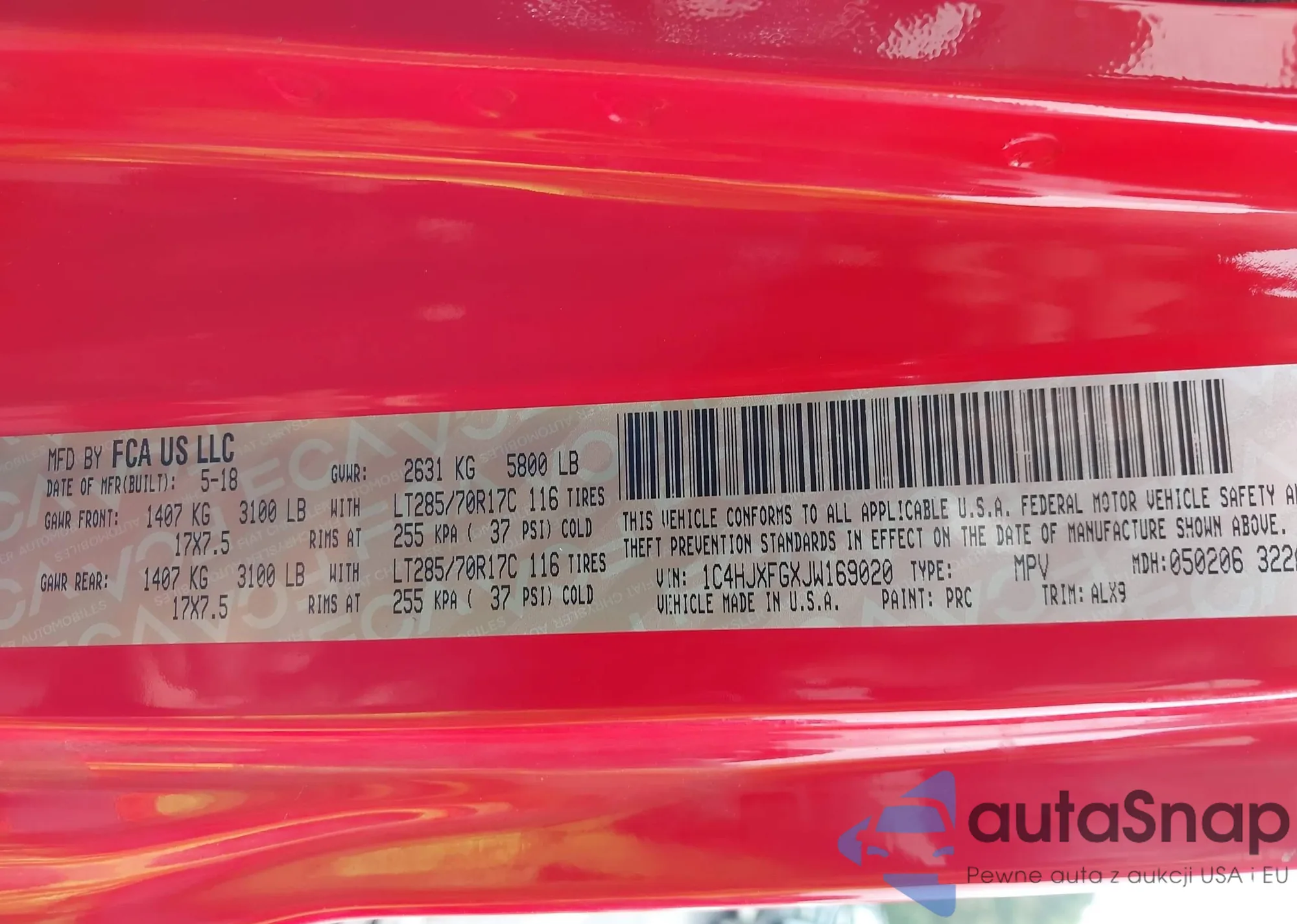 LOT: 43316188 VIN: 1C4HJXFGXJW169020