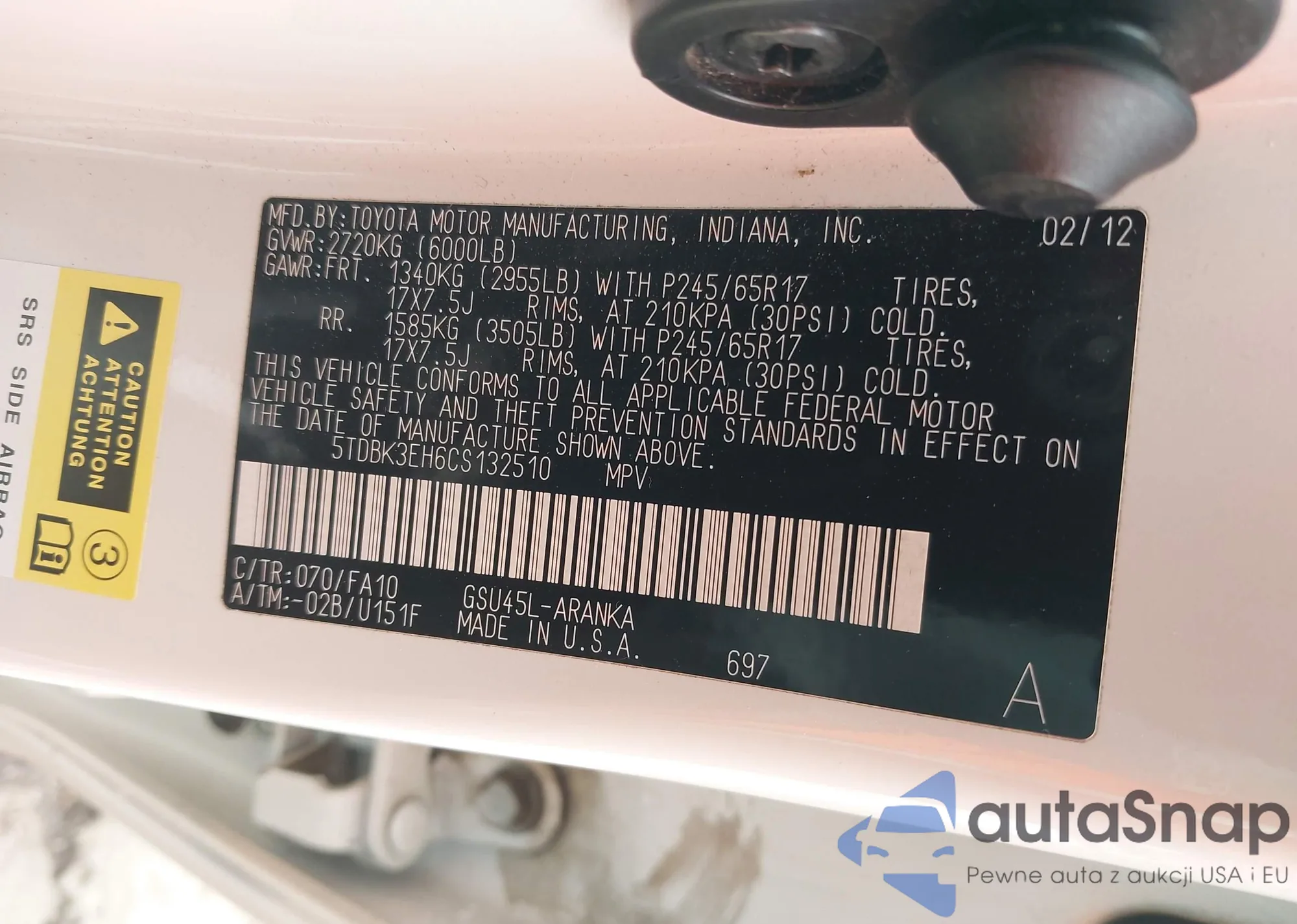LOT: 43519687 VIN: 5TDBK3EH6CS132510