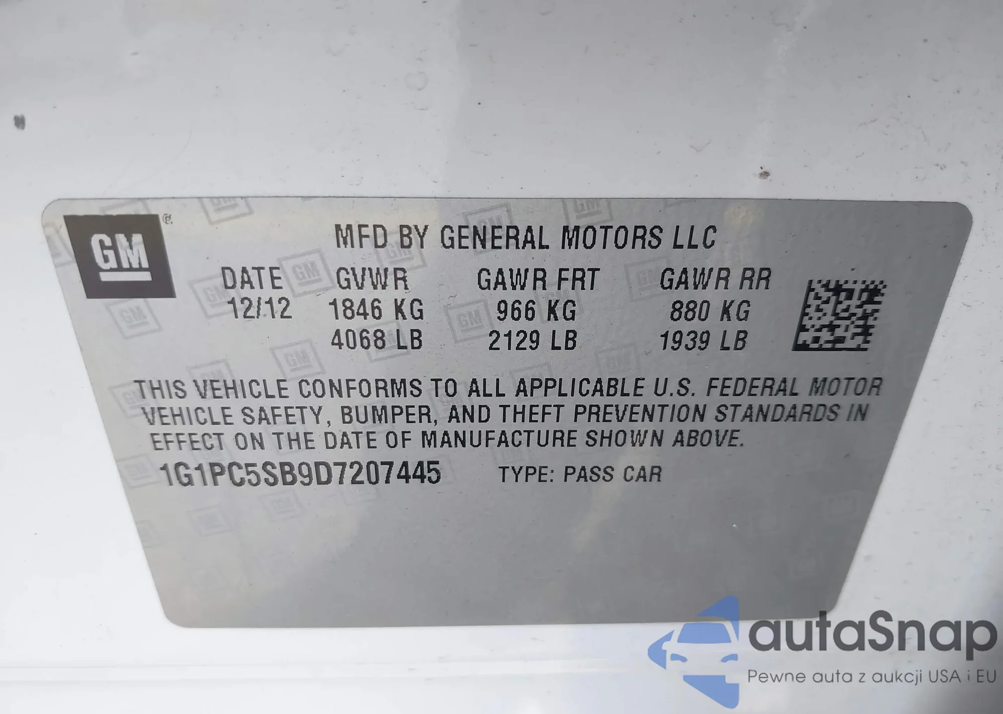 LOT: 43310061 VIN: 1G1PC5SB9D7207445