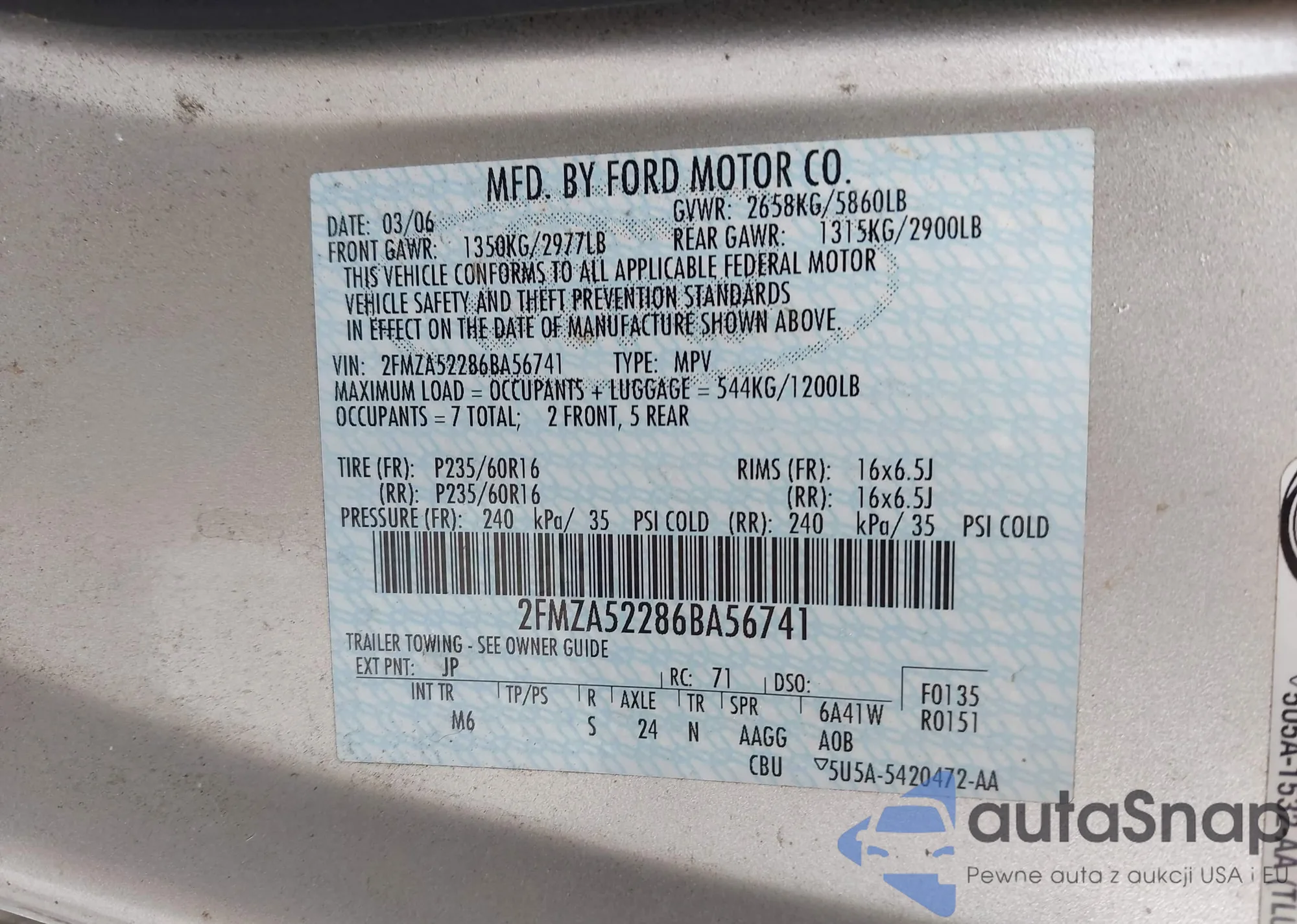 LOT: 43460854 VIN: 2FMZA52286BA56741