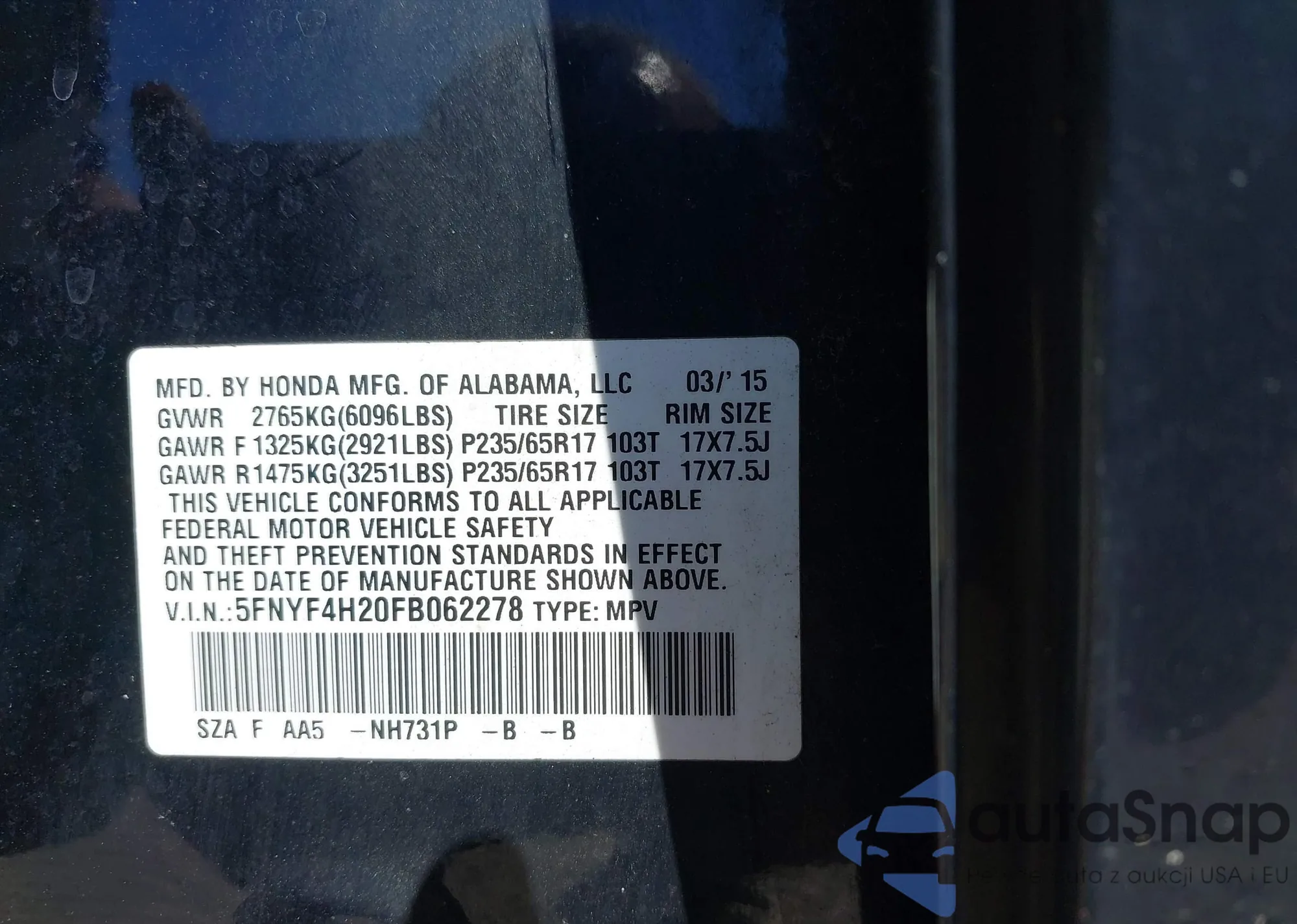 • VIN 5FNRL5H69FB023016
