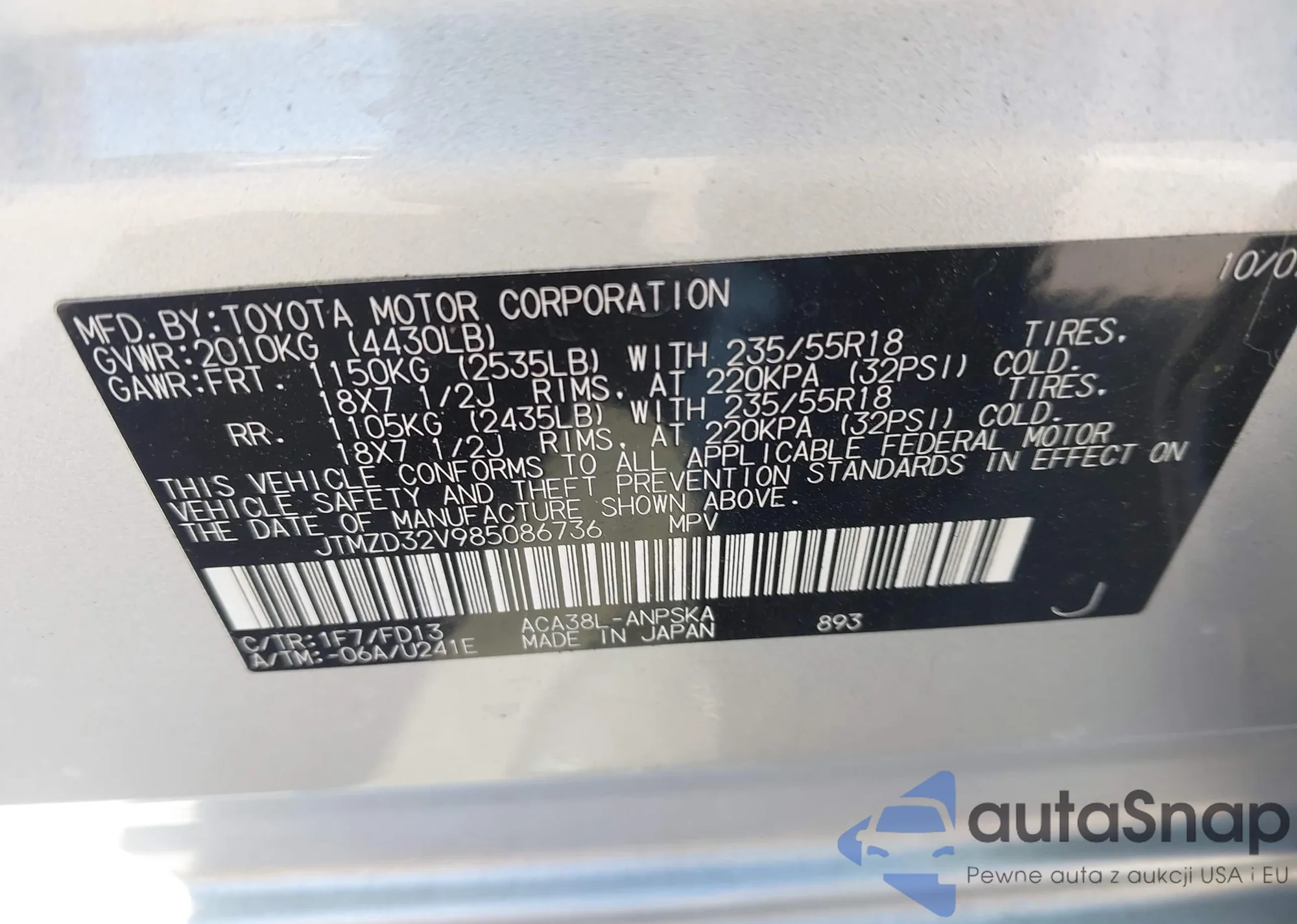 LOT: 43141135 VIN: JTMZD32V985086736