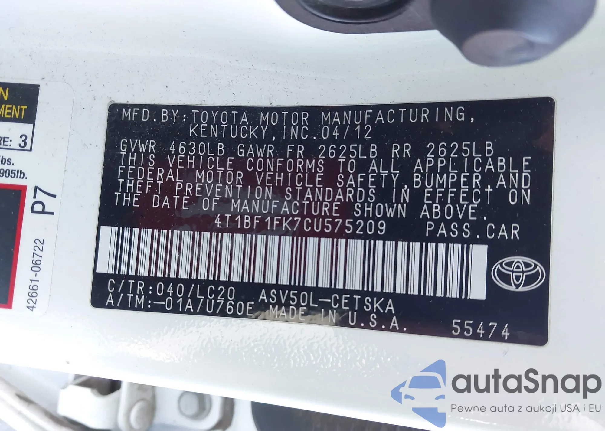 • VIN 4T1BF1FK7CU575209