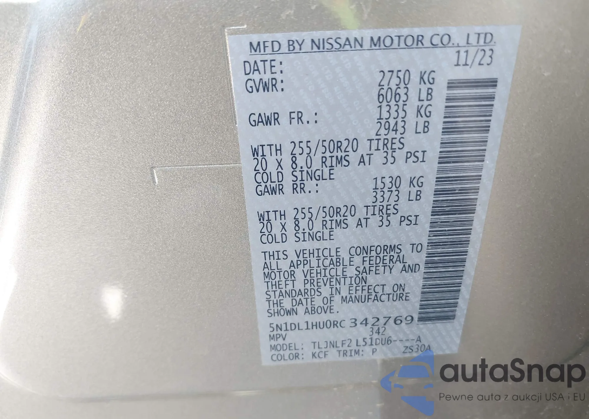 • VIN 5N1DL1HU0RC342769