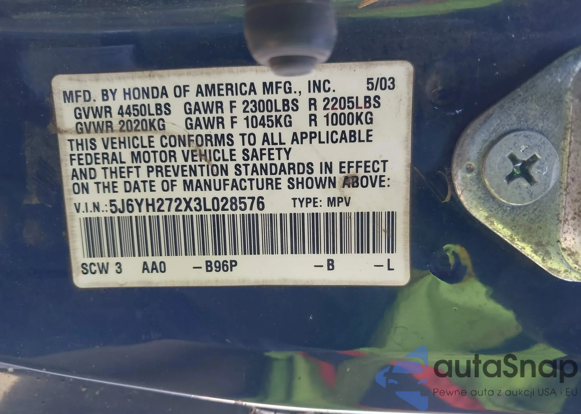 • VIN 5J6YH272X3L028576