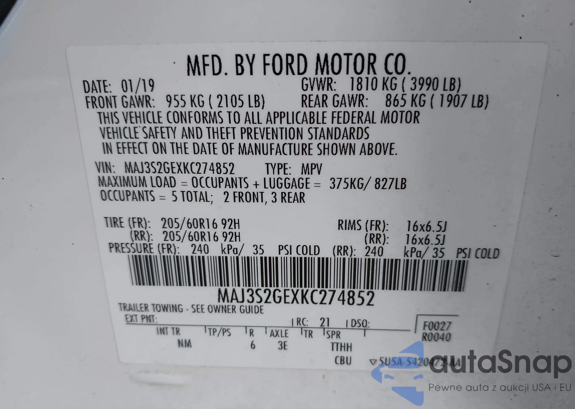LOT: 43241501 VIN: MAJ3S2GEXKC274852
