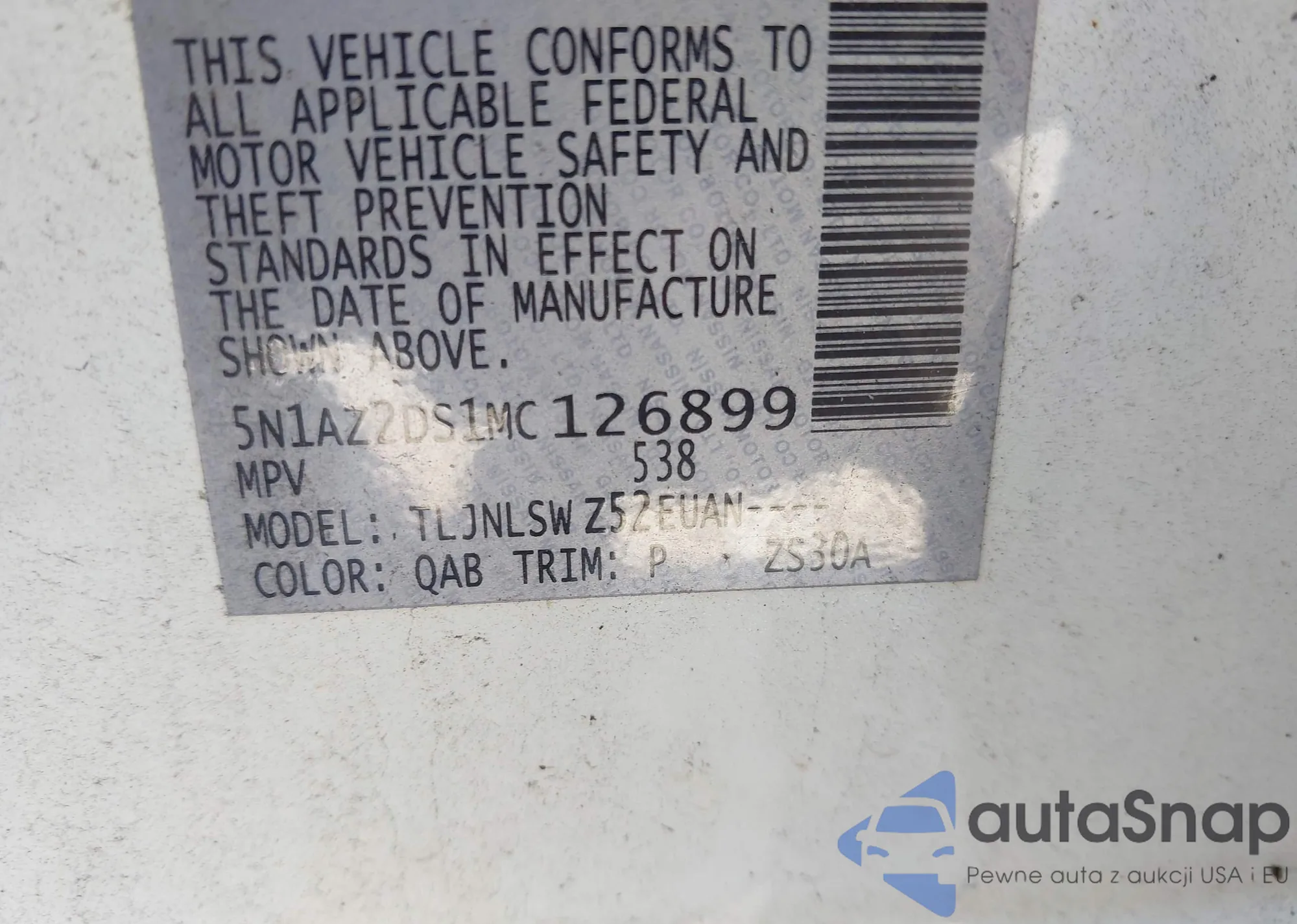 • VIN 5N1AZ2DS1MC126899