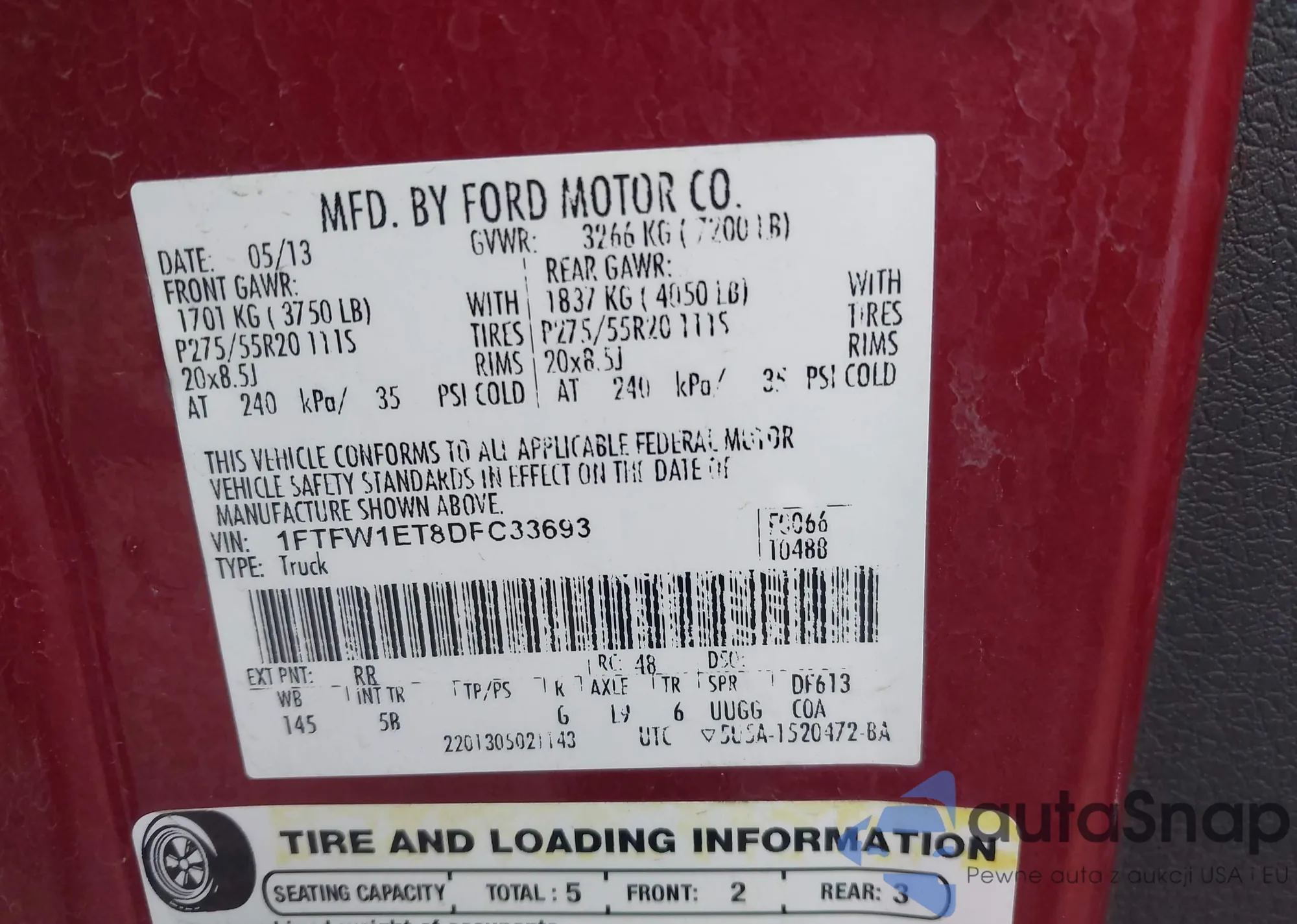 2013 Ford F150 Fx4 from USA, damaged, VIN 1FTFW1ET8DFC33693
