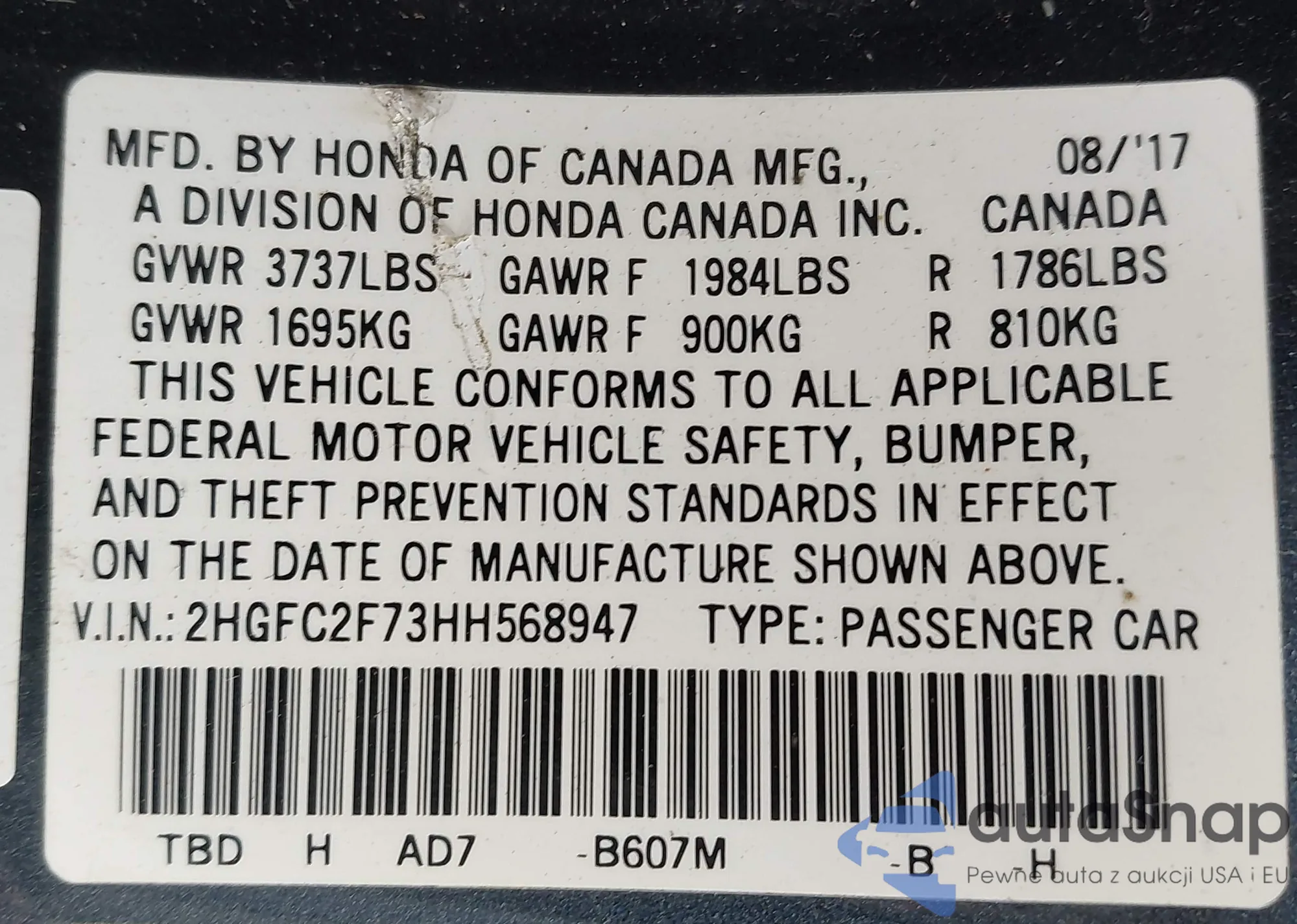 LOT: 43078058 VIN: 2HGFC2F73HH568947