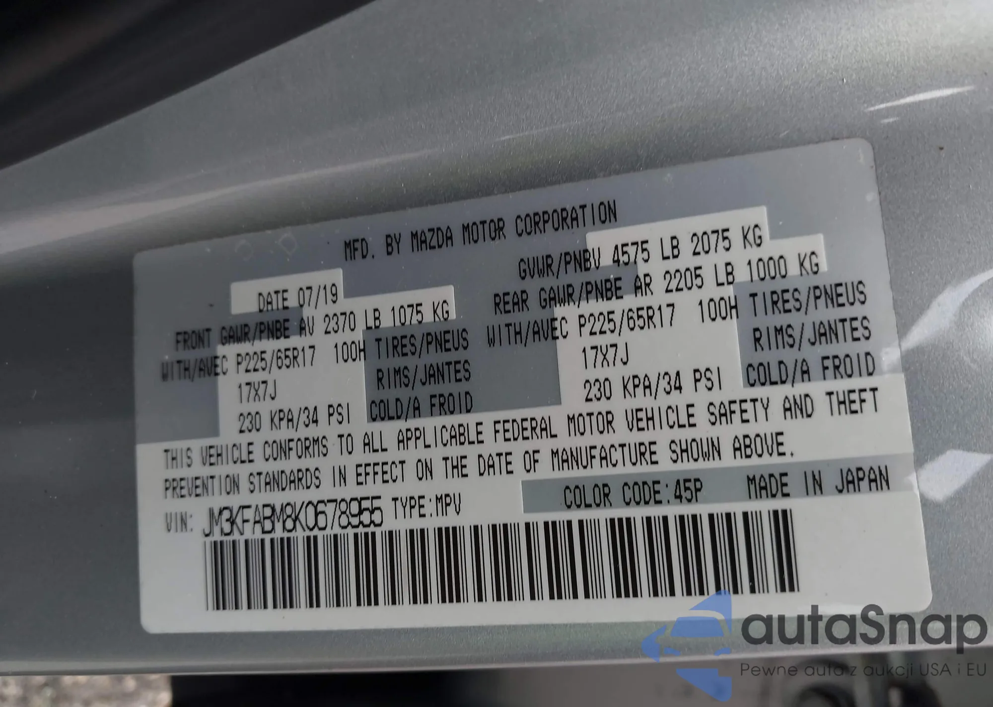 LOT: 42813420 VIN: JM3KFABM8K0678955