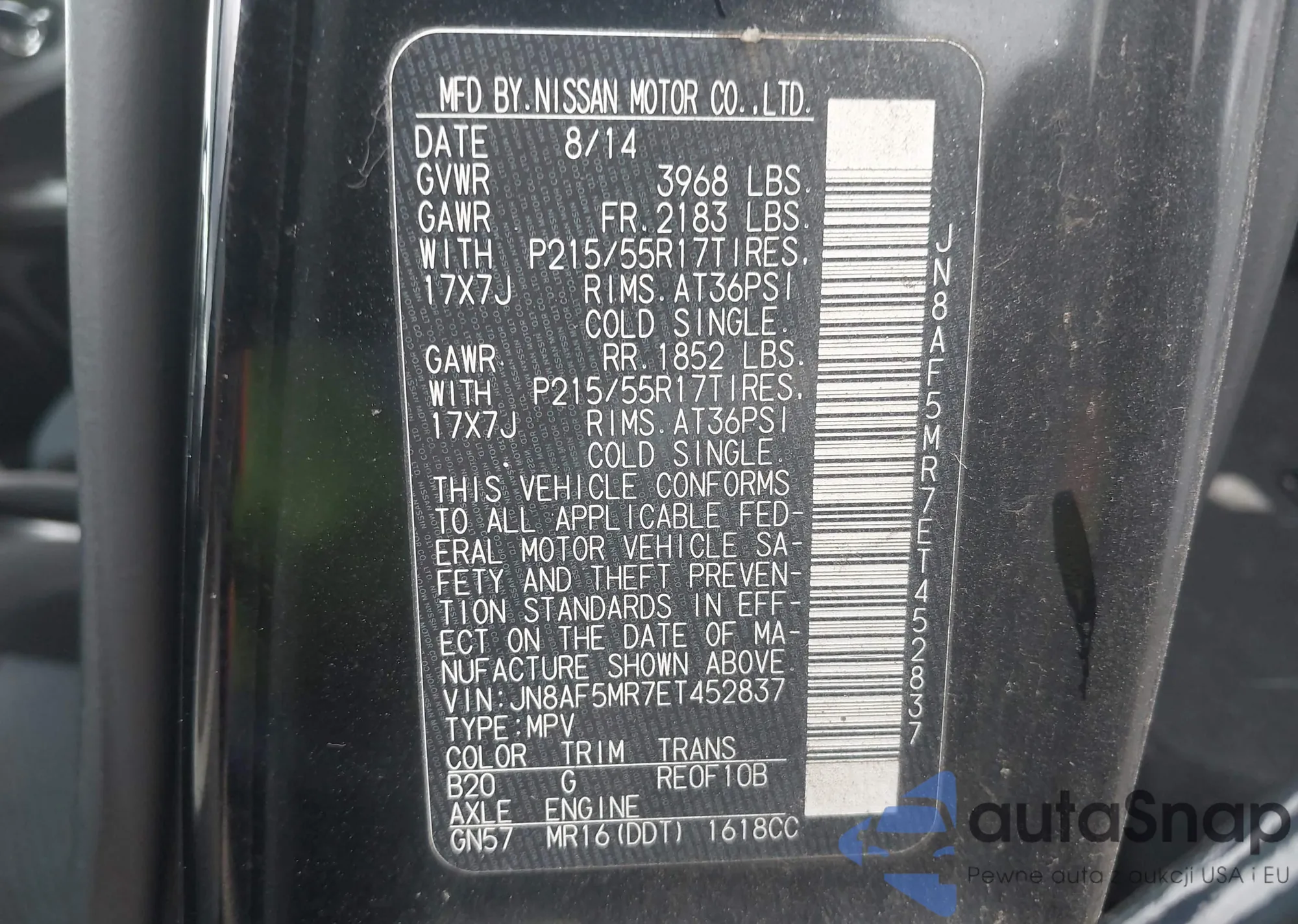 LOT: 43283959 VIN: JN8AF5MR7ET452837