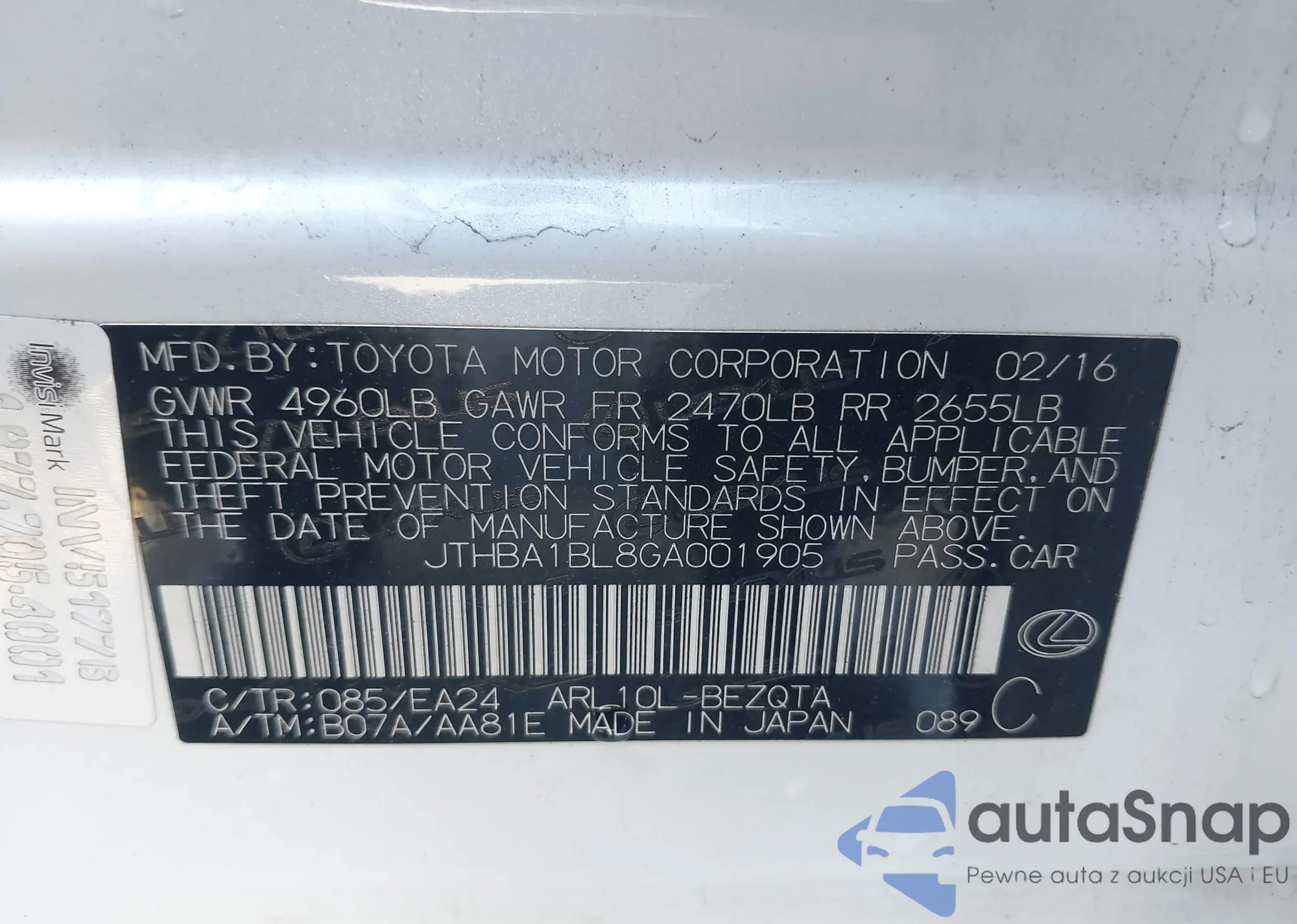 • VIN JTHBA1BL8GA001905