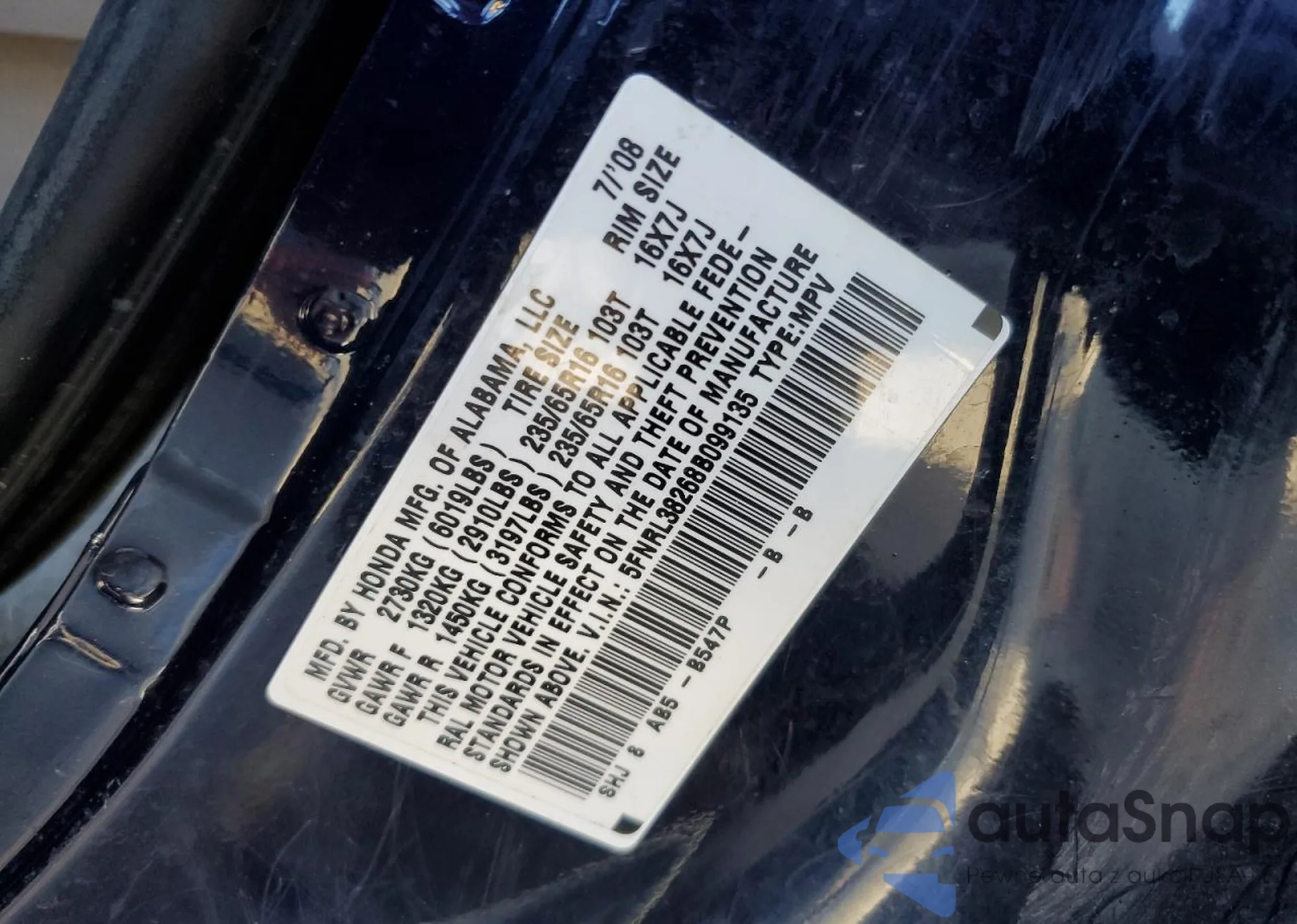• VIN 5FNRL38268B099135