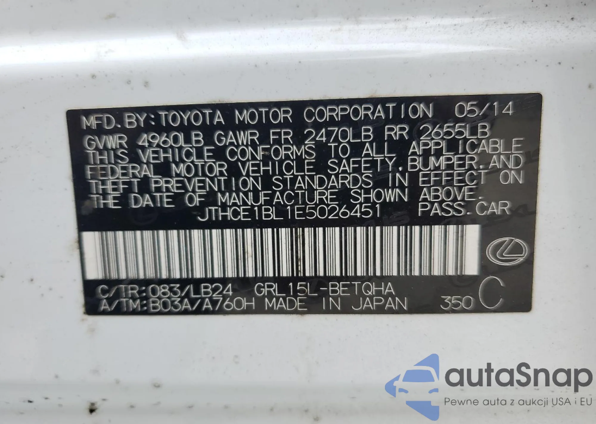 LOT: 80212905 VIN: JTHCE1BL1E5026451
