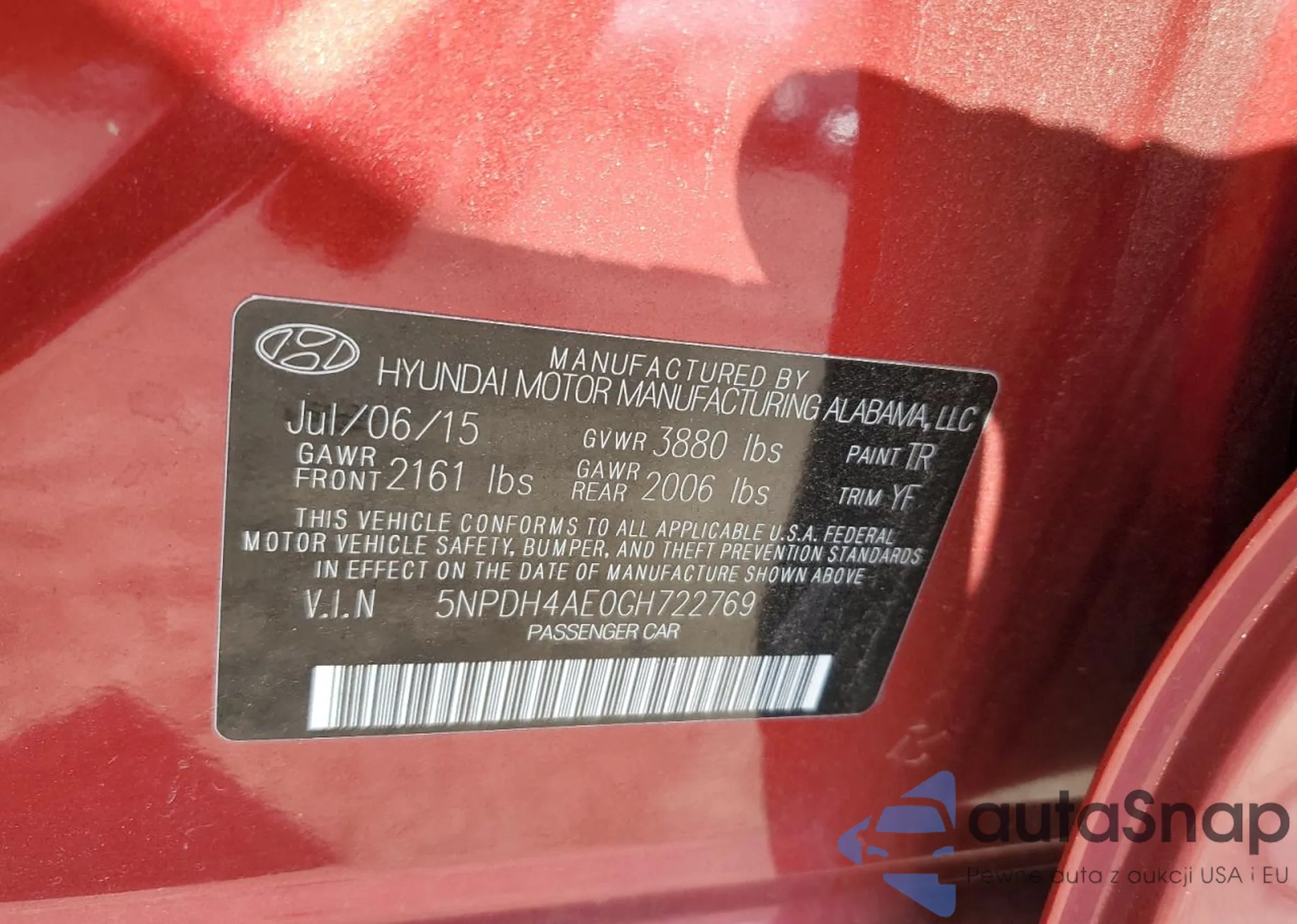 LOT: 89739865 VIN: 5NPDH4AE0GH722769