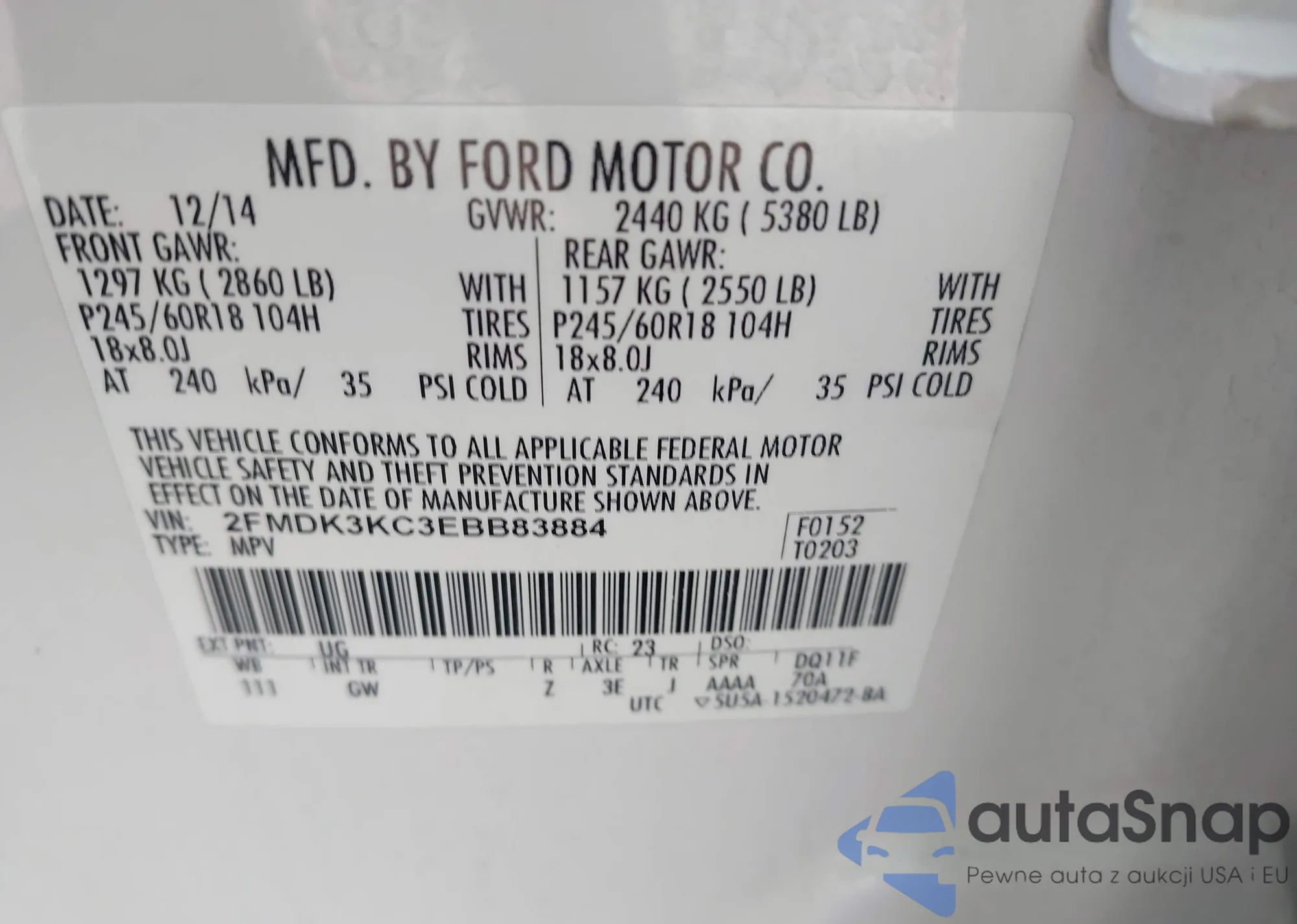 LOT: 43252775 VIN: 1FMCU9G98EUA07154