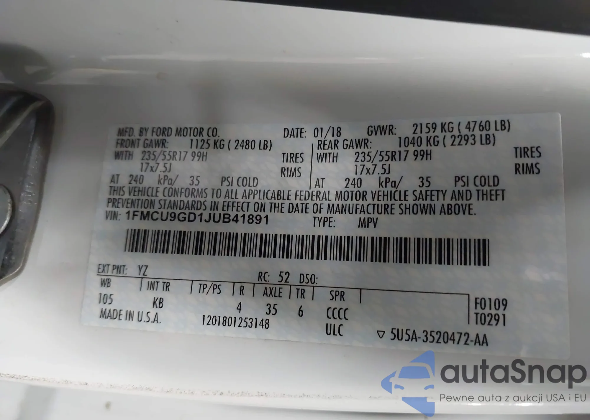 • VIN 1FMCU9GD1JUB41891
