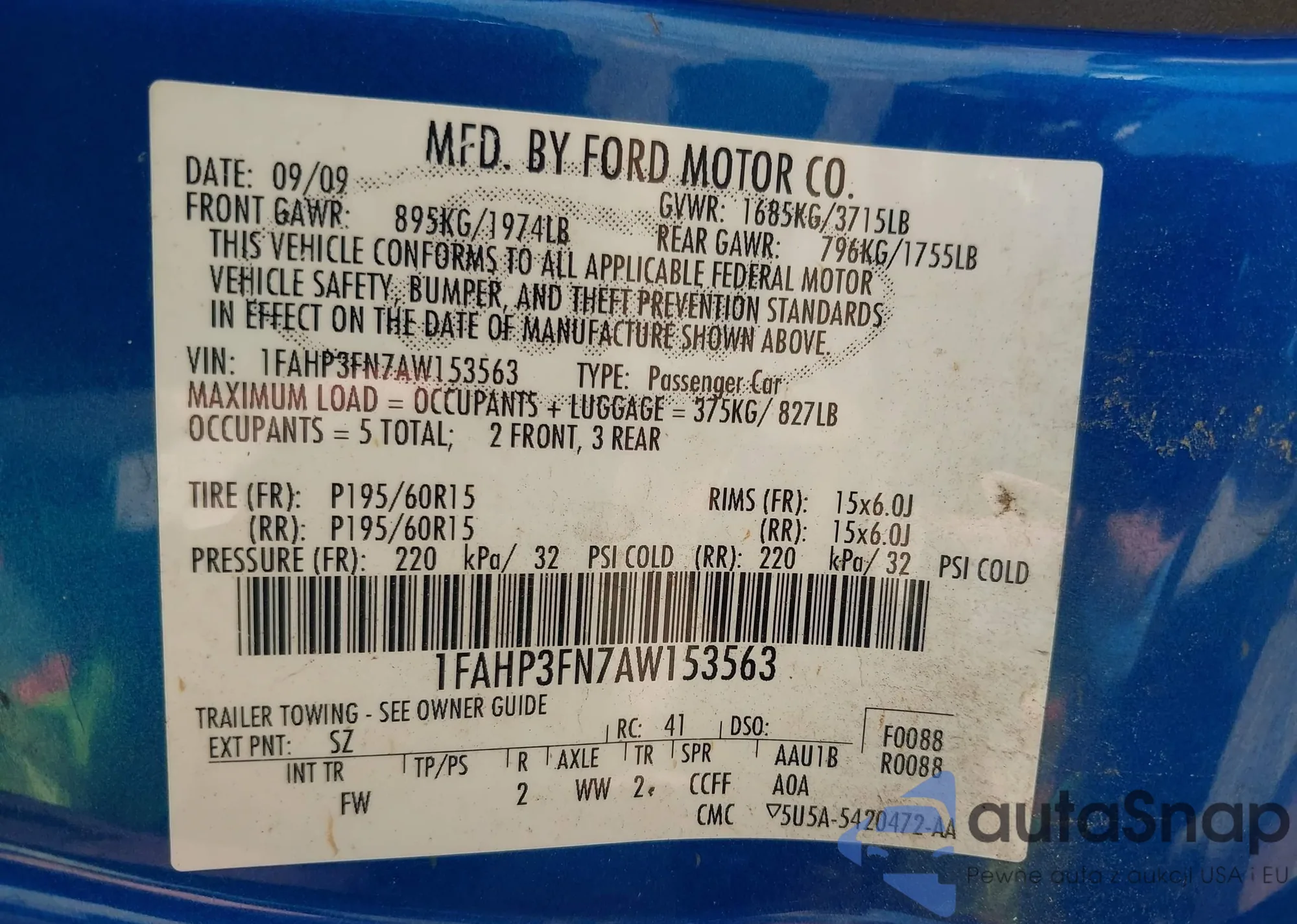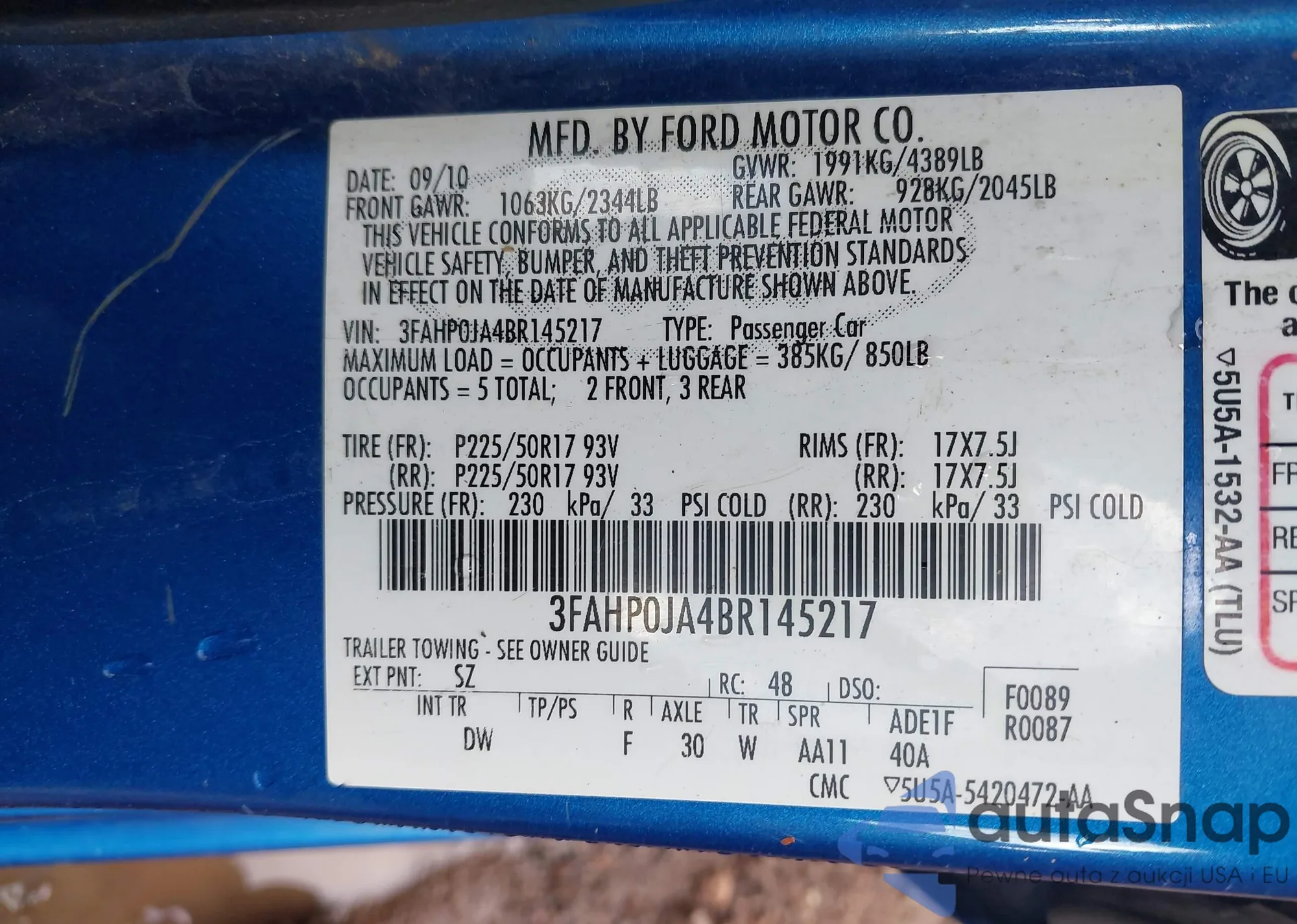 • VIN 3FAHP0HA9BR234495