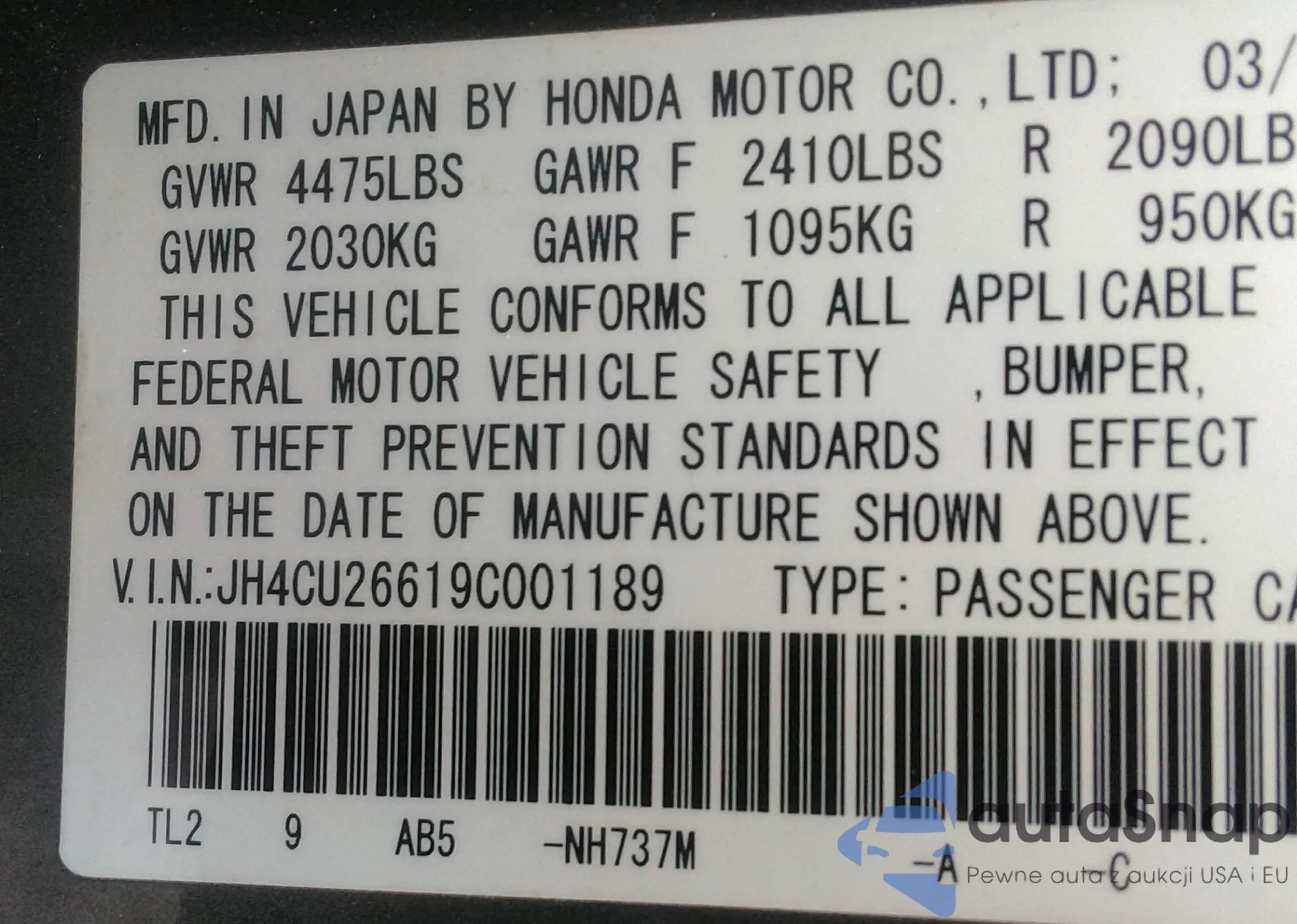 LOT: 43057403 VIN: JH4CU26619C001189