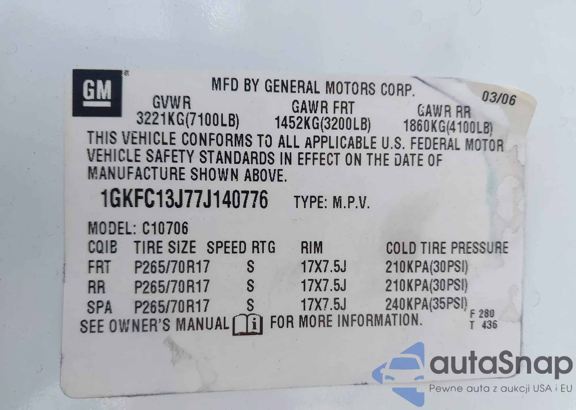 LOT: 43253776 VIN: 1GKFC13J77J140776