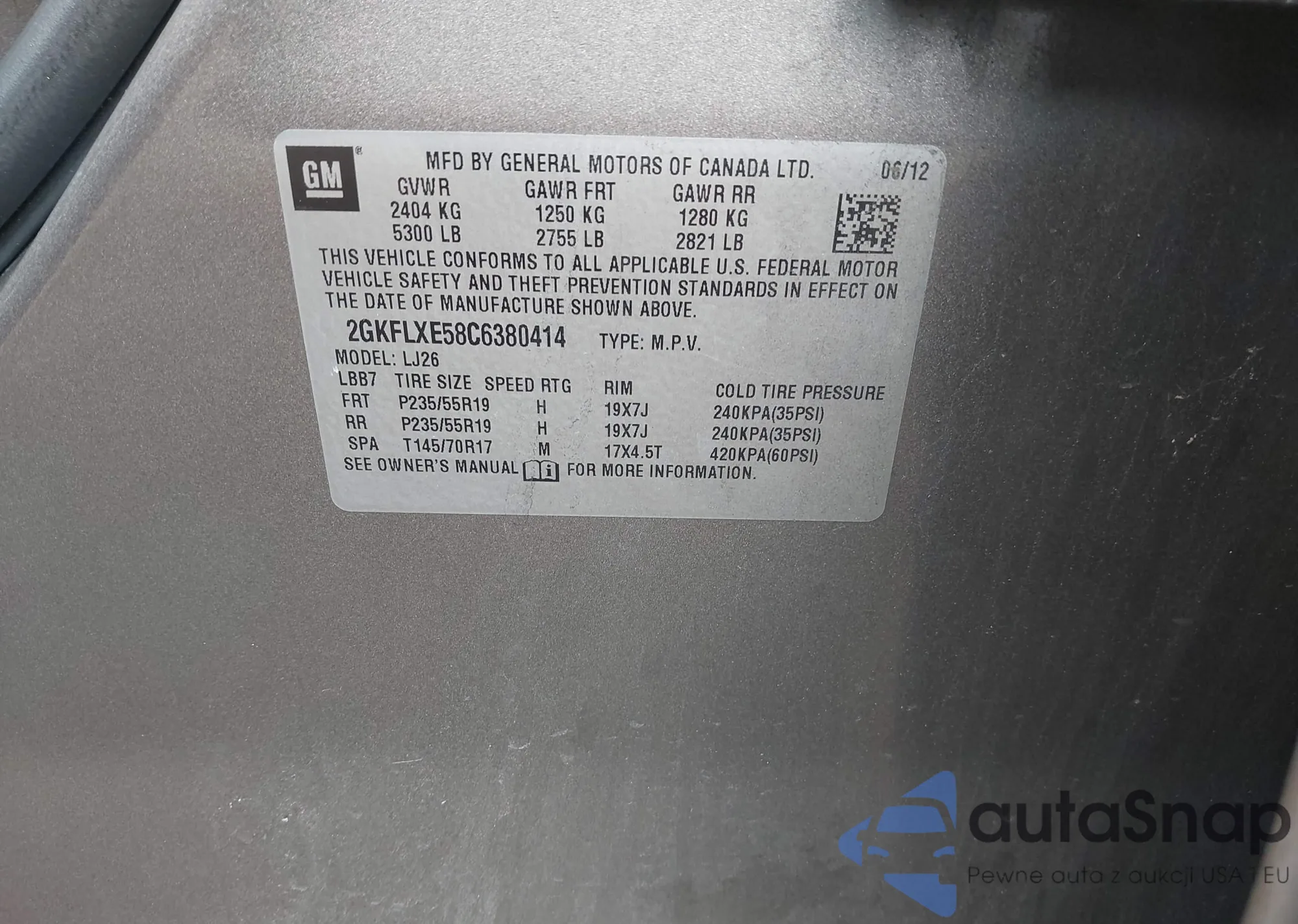 LOT: 43261700 VIN: 2GKFLXE58C6380414